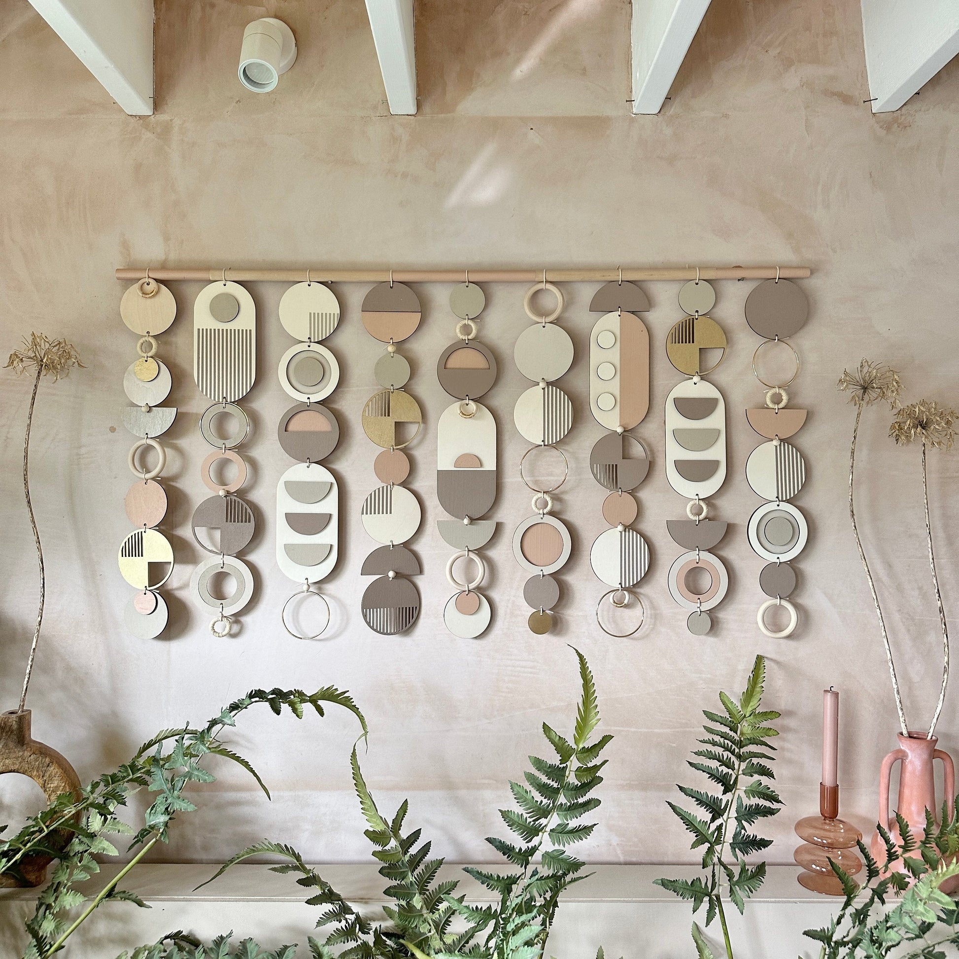 This large abstract modern wall art will make for a great statement piece in your home decor great for filling an empty wall with some interest. This abstract wall hanging is handmade and painted in neutral tones using a blush pink, grey and beige with gold accents. Some pieces are left unpainted to let the natural colour of the wood show.