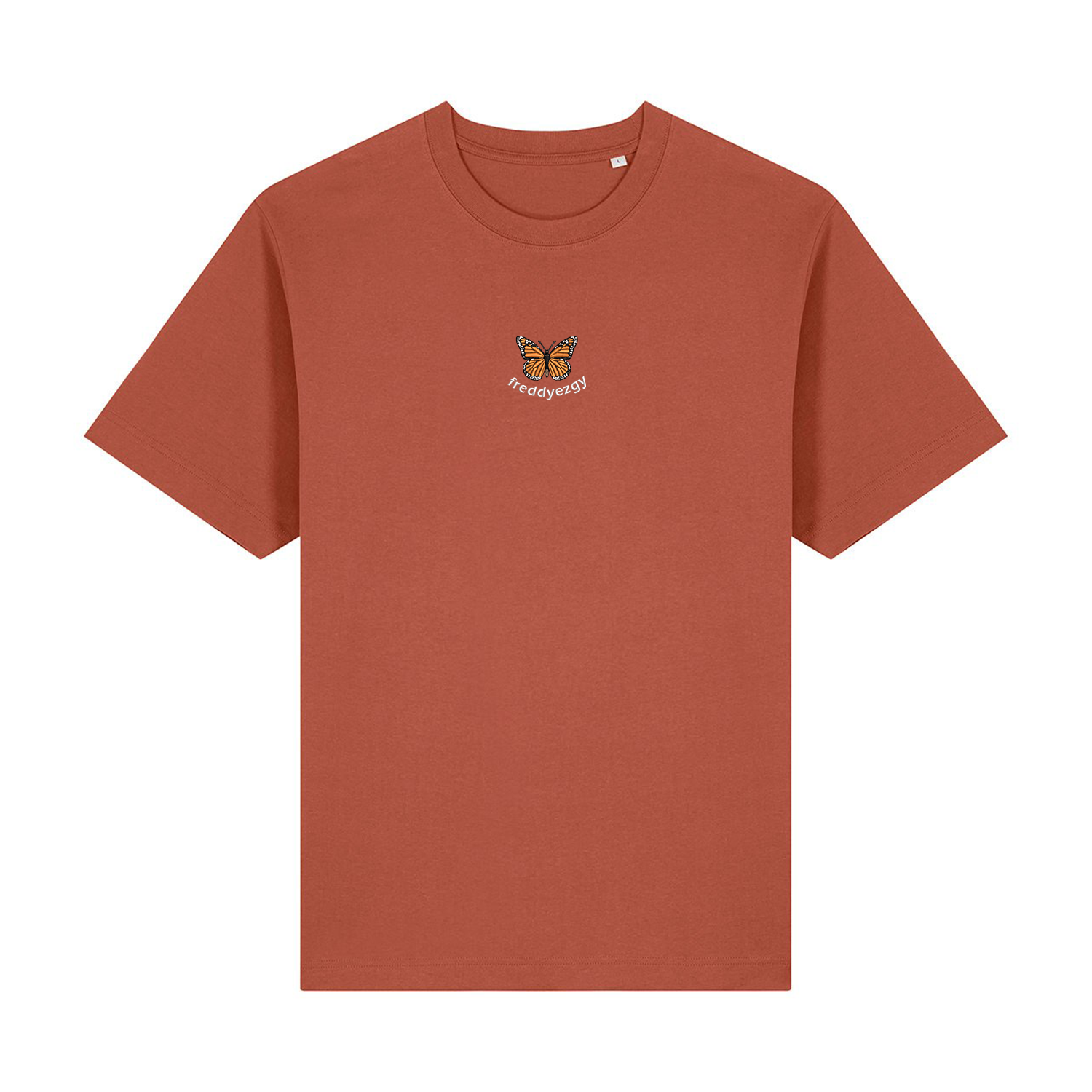 A tribute to one of nature’s great travellers, the Monarch Butterfly T-shirt features vibrant orange embroidery that speaks of movement, memory, and warmth. Freddyezgy pairs this symbol of migration with earthy tones, from terracotta-like heritage brown to raw natural beige.