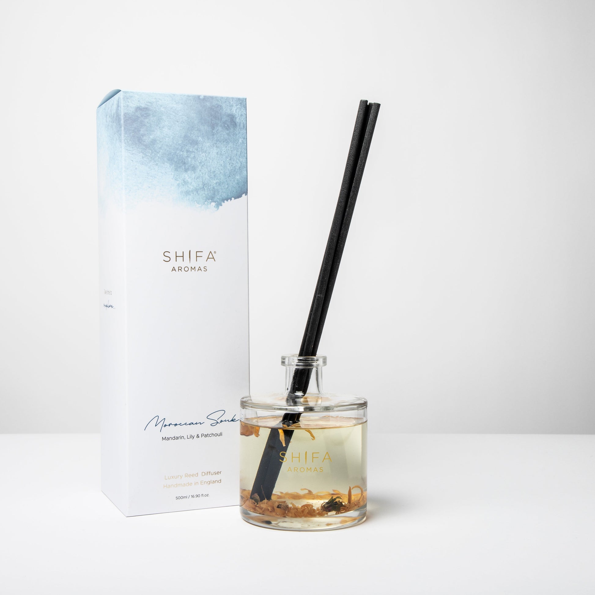 Moroccan Souk is an adventurous mix of rich accords of Mandarin Tea and Lily supported by Moroccan spices, Orange Blossom and Jasmine resting on a base of Sandal, Patchouli and Musk. The luxury glass candle and diffuser are infused with Orange Blossom Flowers, Frankincense & Myrrh resin crystals.