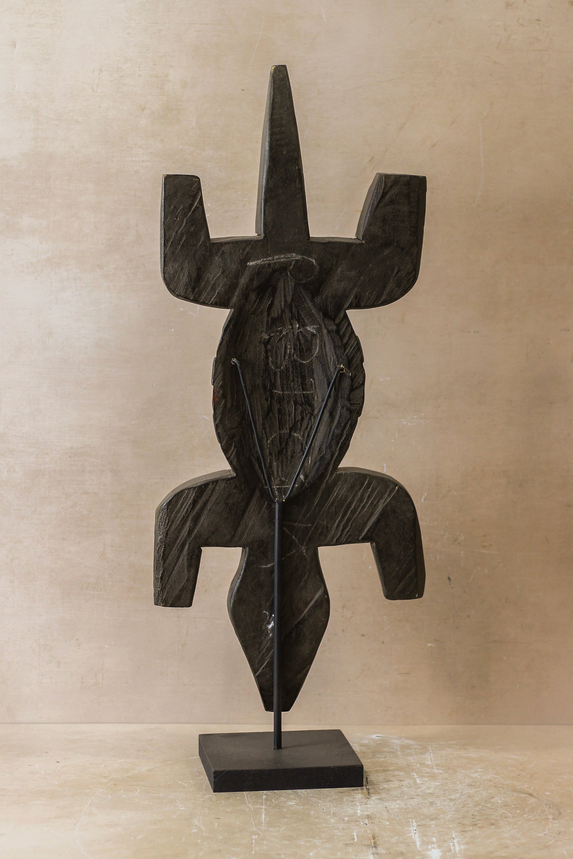 Mossi Crocodile Mask Carving - Mali. Covered with black, white, red and blue pigment patterns. Comes mounted on a standThe Mossi Crocodile Mask Carving from Mali is a striking example of traditional African craftsmanship. Hand-carved from wood, this mask features intricate detailing that reflects the cultural significance of the crocodile in Mossi society, often symbolizing strength and protection. The mask is adorned with bold geometric patterns in black, white, red, and blue pigments, each color holding symbolic meaning within the community. These pigments create a vivid contrast against the natural texture of the wood, giving the mask a dynamic, eye-catching appearance. The piece comes mounted on a sturdy stand, making it an ideal display for art collectors and enthusiasts of African culture. Perfect for adding a rich cultural and artistic touch to any space.