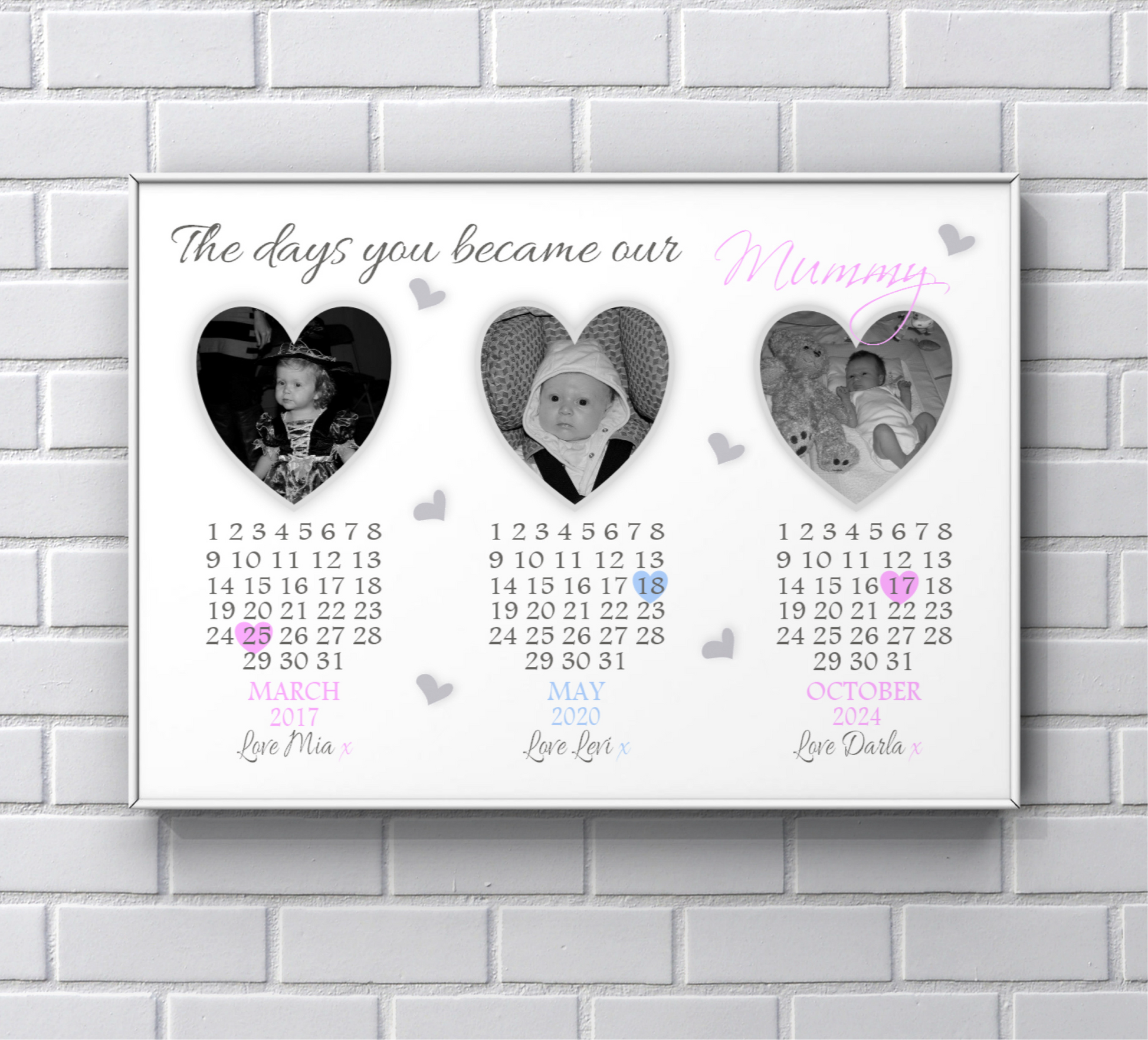 All pictures will be printed in black and white. Please upload three good quality, clear pictures. Please ensure that the babies heads are central to the photos, this is to give enough room to crop the photo into a heart.