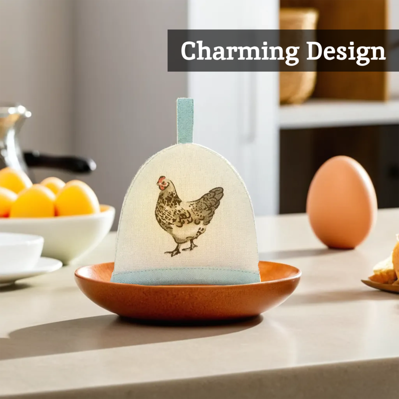 - Egg cosy featuring a delightful hen design on a cream base.