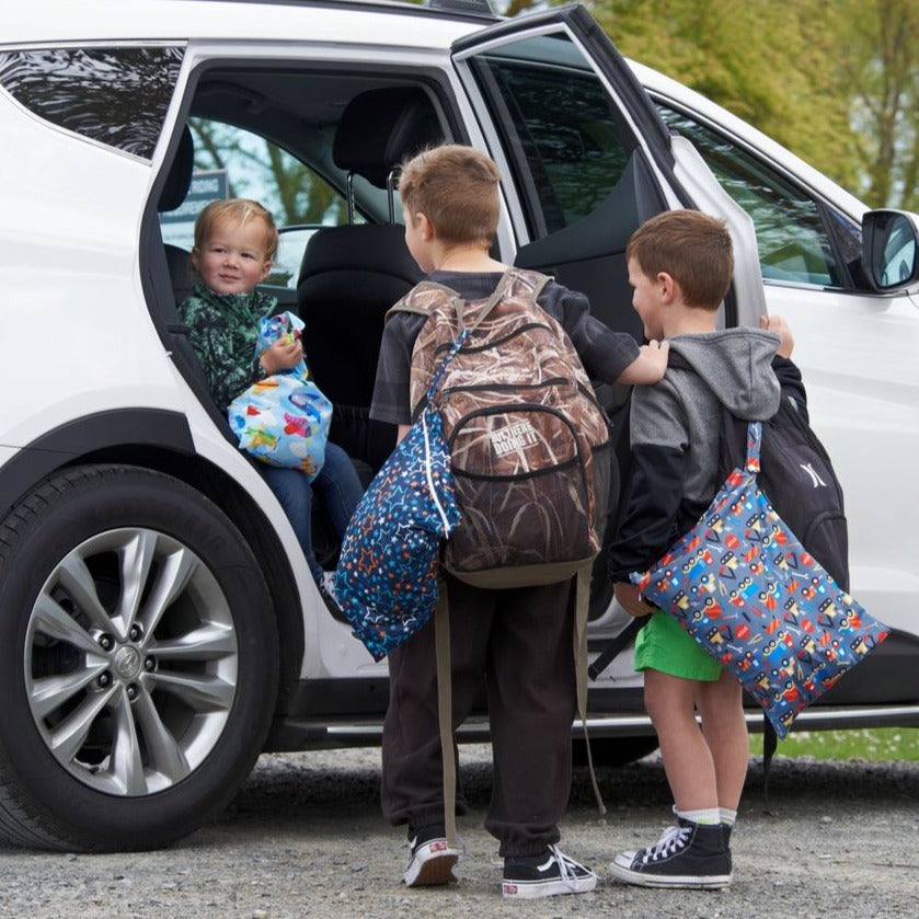 Wet bags are re-usable, odour reducing, 100% waterproof bags with a zip and strap with a popper (great for hanging or attaching to children’s bags or the pushchair).