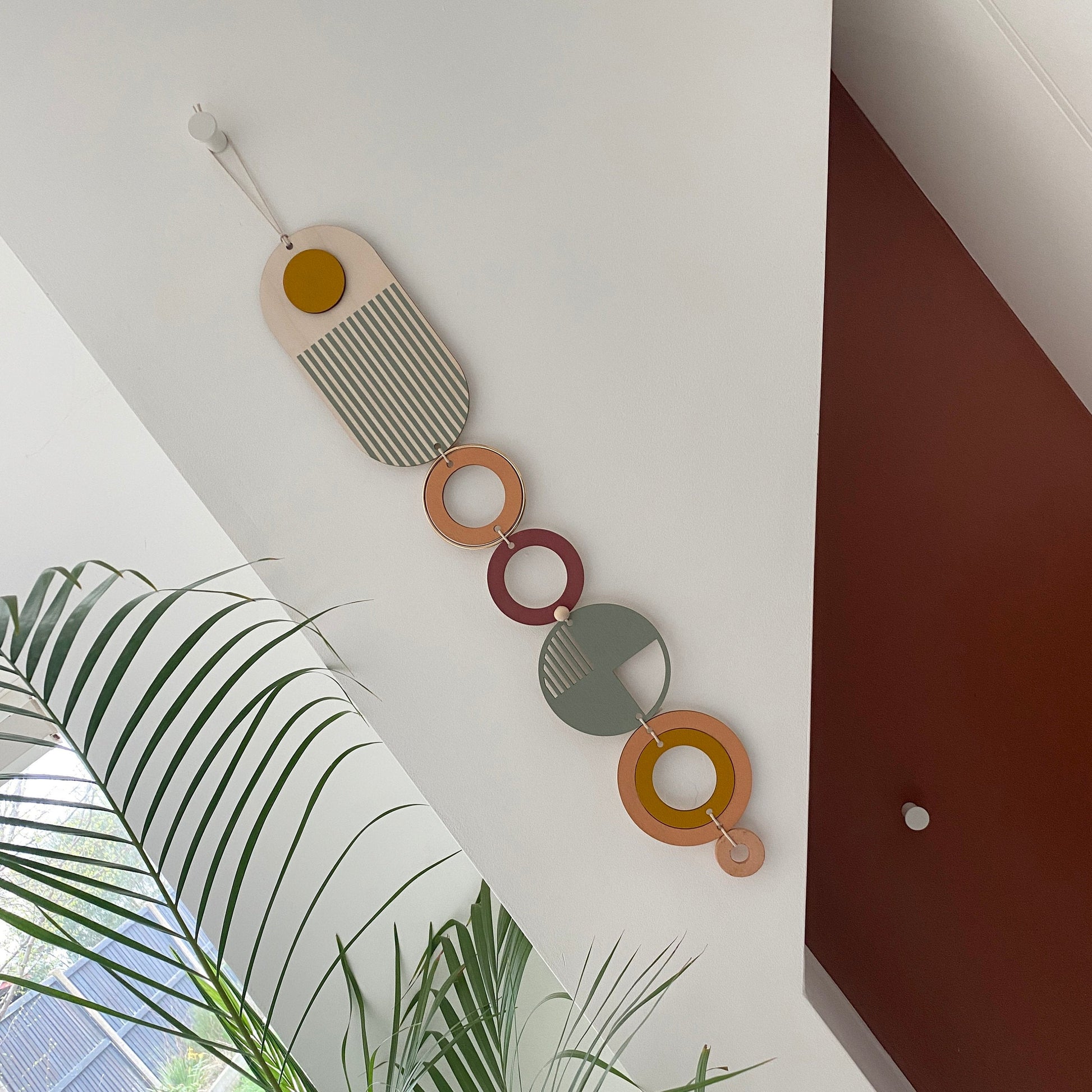 Lovingly handmade modern wall art. This Piece is made from plywood, paint, waxed cord, ceramics and wooden beads. The colours used are mustard, sage, coral and purple with a gold ring. This slim wall hanging would make a beautiful addition to any room to create a modern mid-century feel. Made from sustainable plywood, hand painted and constructed in Milton Keynes, England.