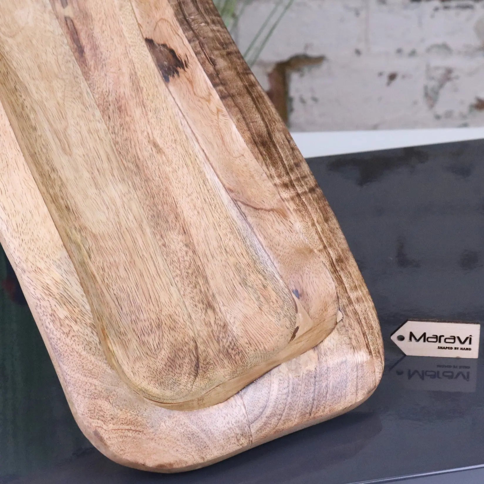 Add organic warmth to your kitchen or dining table with the Nalita wooden dough bowl. Hand-carved from solid mango wood, this elongated 57cm dish features a smooth finish and visible natural grain that highlights the unique character of each piece. Its classic scooped shape and gently curved edges create a tactile, artisanal feel that works beautifully in farmhouse, rustic, or boho-style interiors.