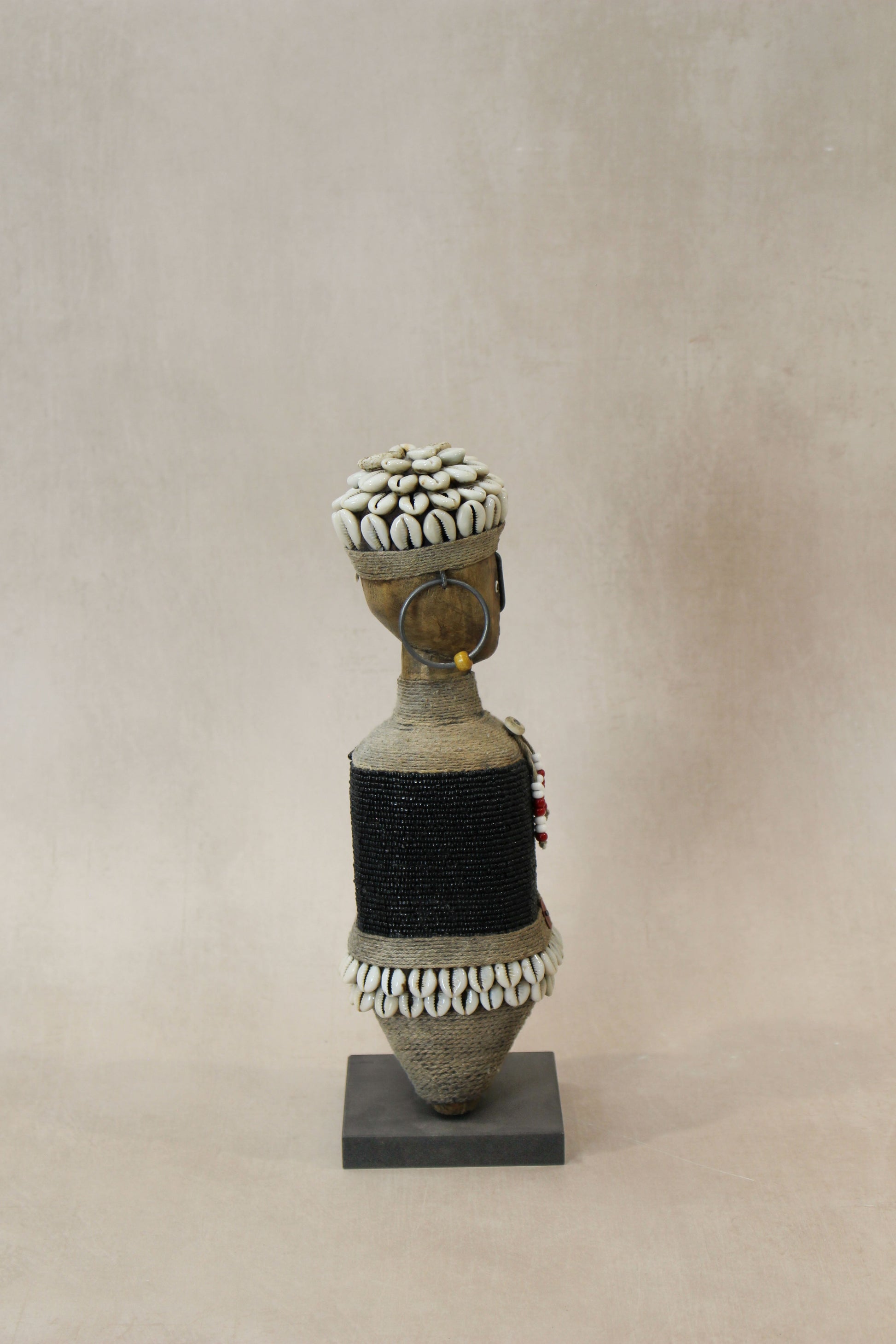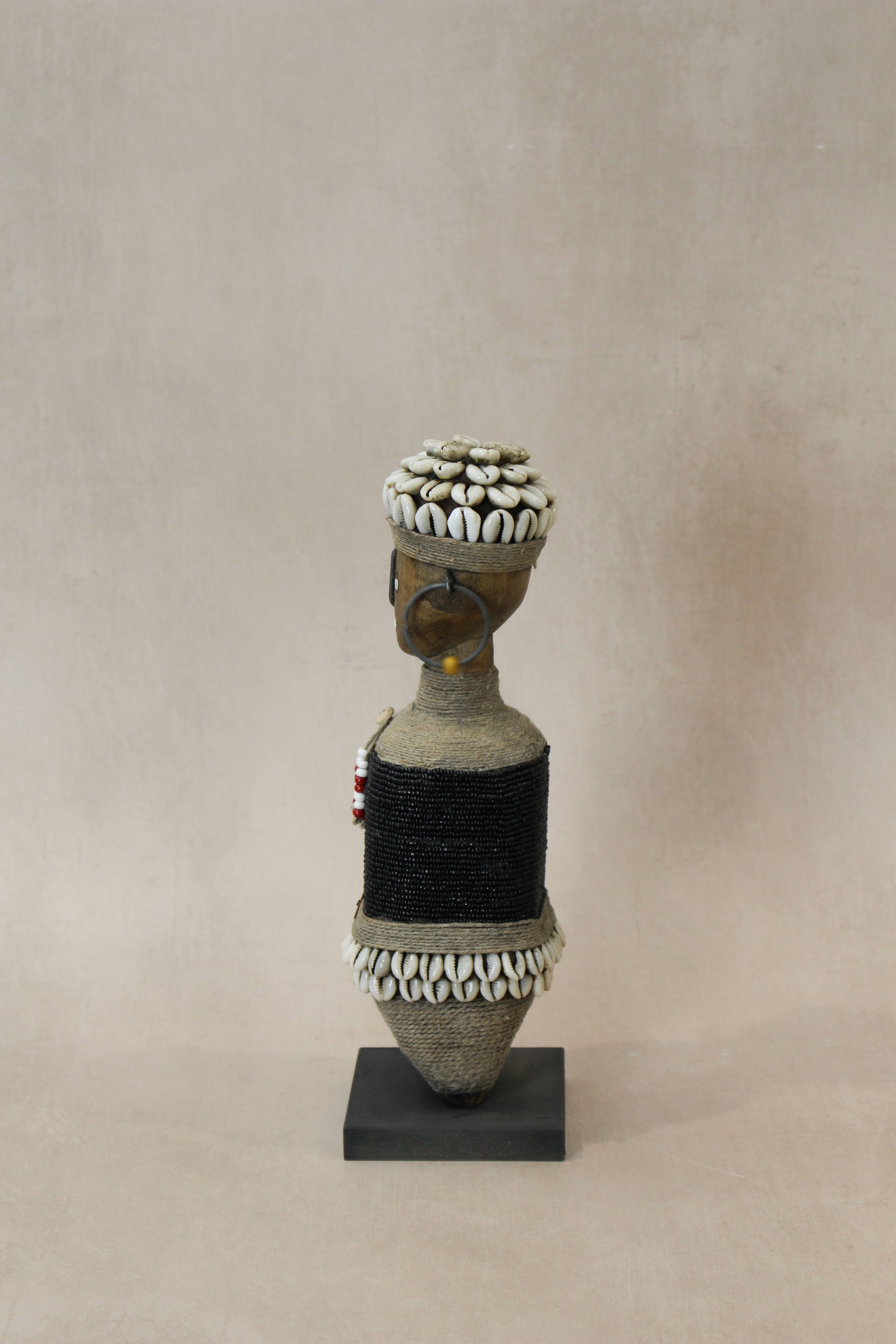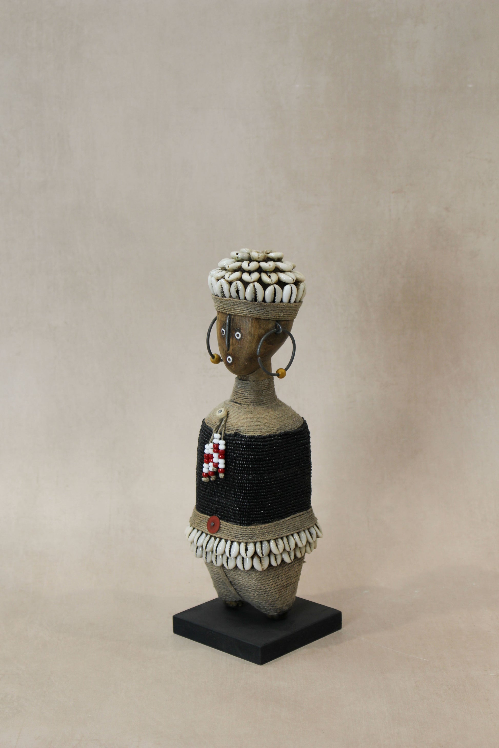 Namchi/Namji dolls are carved from African Rosewood, a legume tree native to the Democratic Republic of Congo, Cameroon, Gabon and Equatorial Guinea. A single block of African Rosewood wood is hand carved into a geometric shape and decorated with multi coloured beads, metals, fibre, cowrie shells, coins, and even leather. Each doll is carved with a unique stature and facial expression. Unadorned dolls made by blacksmiths are played with by young children.