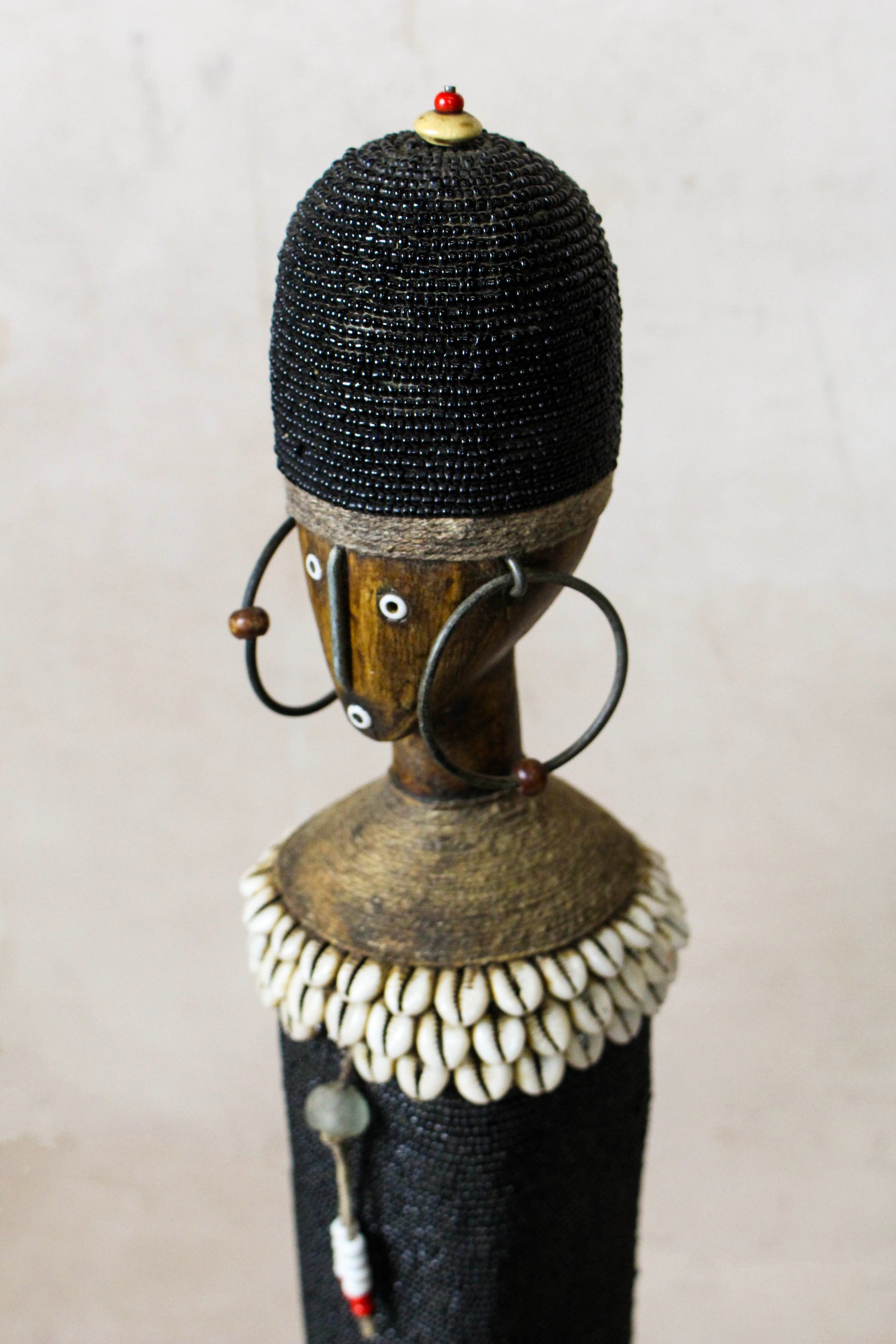 Namchi/Namji dolls are carved from African Rosewood, a legume tree native to the Democratic Republic of Congo, Cameroon, Gabon and Equatorial Guinea. A single block of African Rosewood wood is hand carved into a geometric shape and decorated with multi coloured beads, metals, fibre, cowrie shells, coins, and even leather. Each doll is carved with a unique stature and facial expression. Unadorned dolls made by blacksmiths are played with by young children.