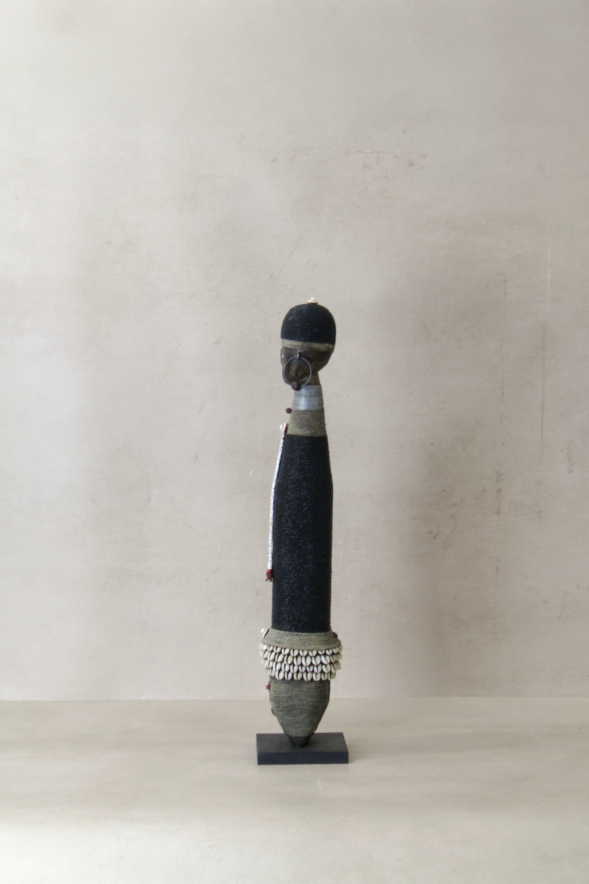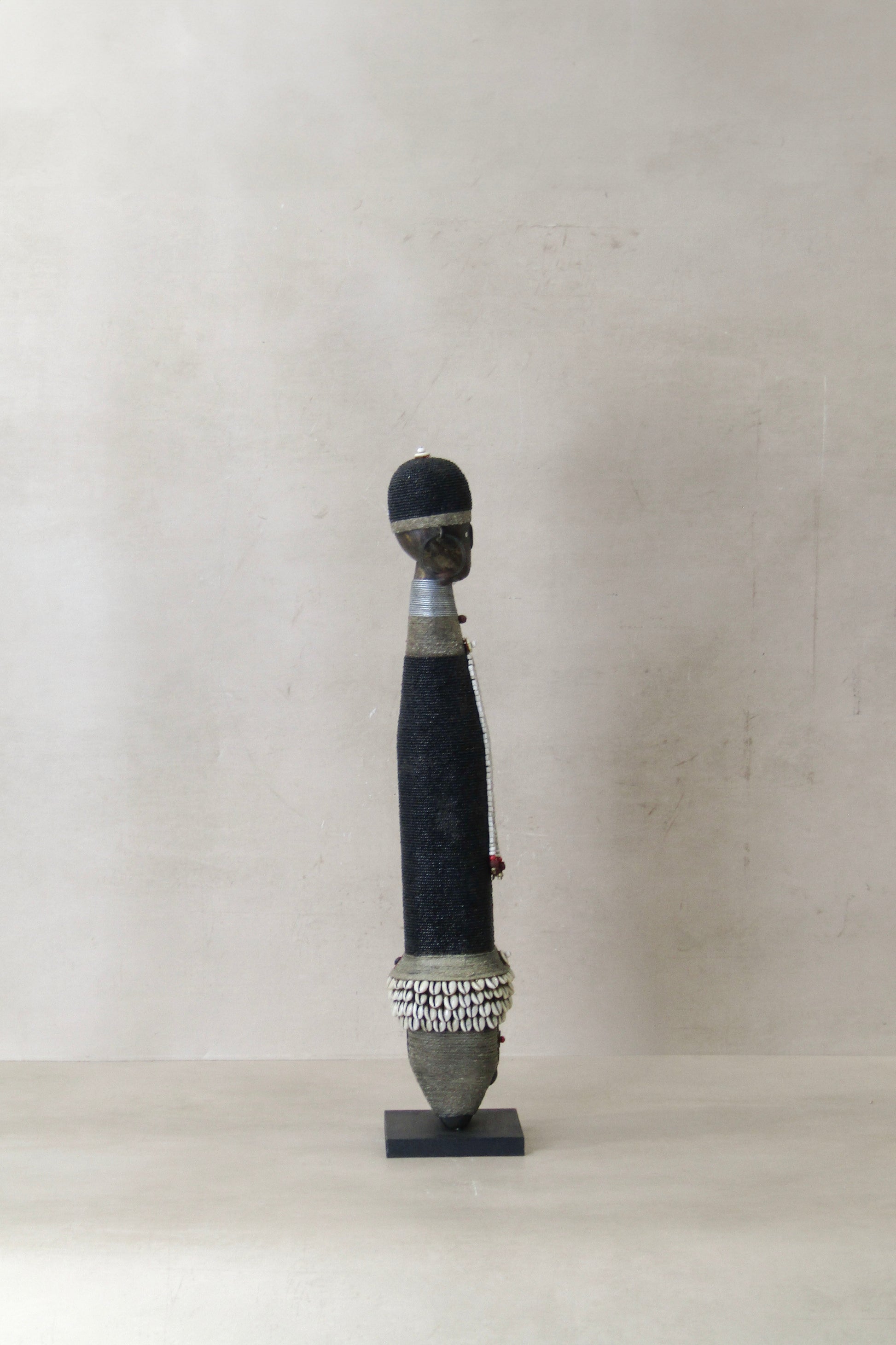 Namchi/Namji dolls are carved from African Rosewood, a legume tree native to the Democratic Republic of Congo, Cameroon, Gabon and Equatorial Guinea. A single block of African Rosewood wood is hand carved into a geometric shape and decorated with multi coloured beads, metals, fibre, cowrie shells, coins, and even leather. Each doll is carved with a unique stature and facial expression. Unadorned dolls made by blacksmiths are played with by young children.