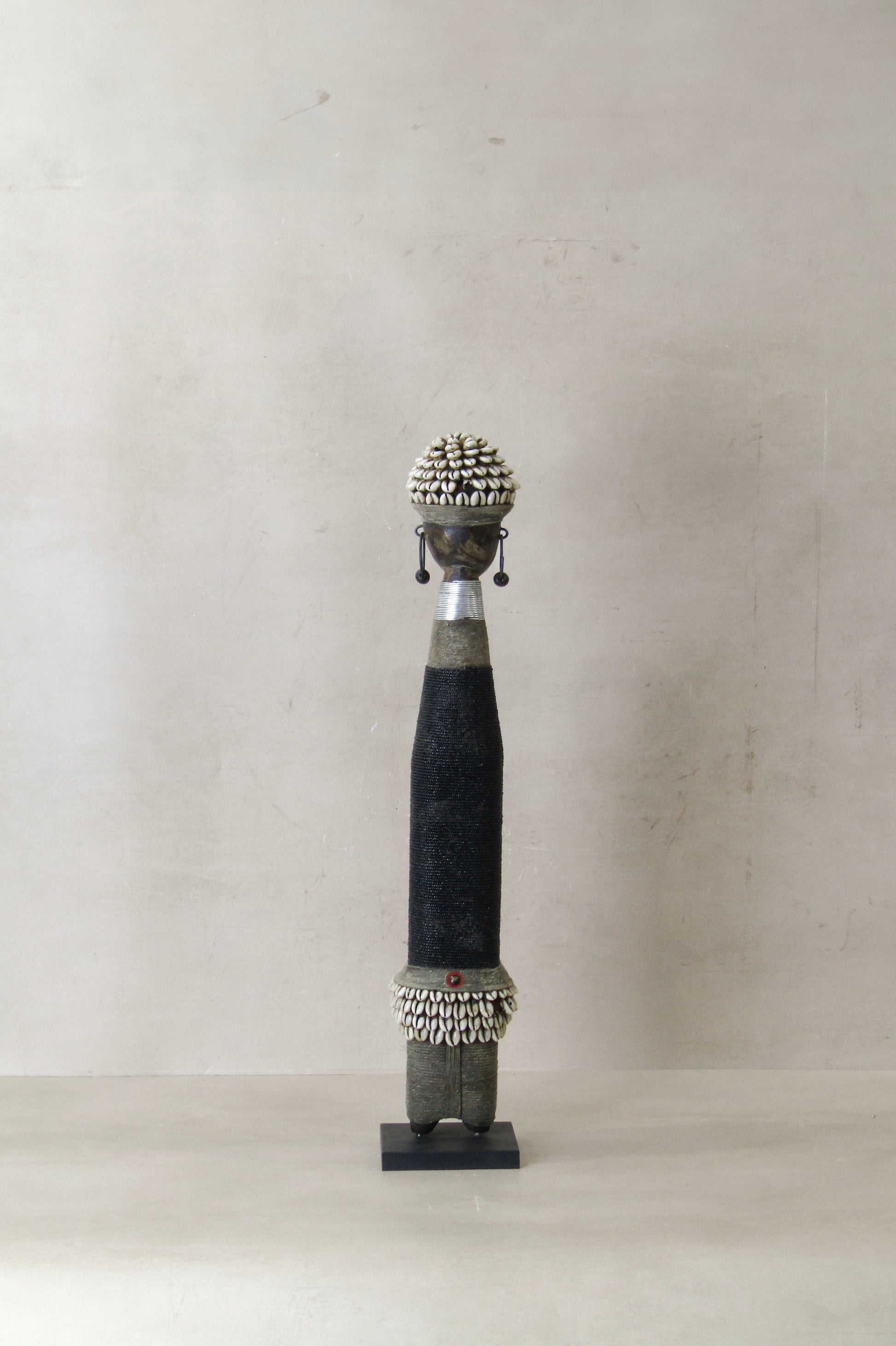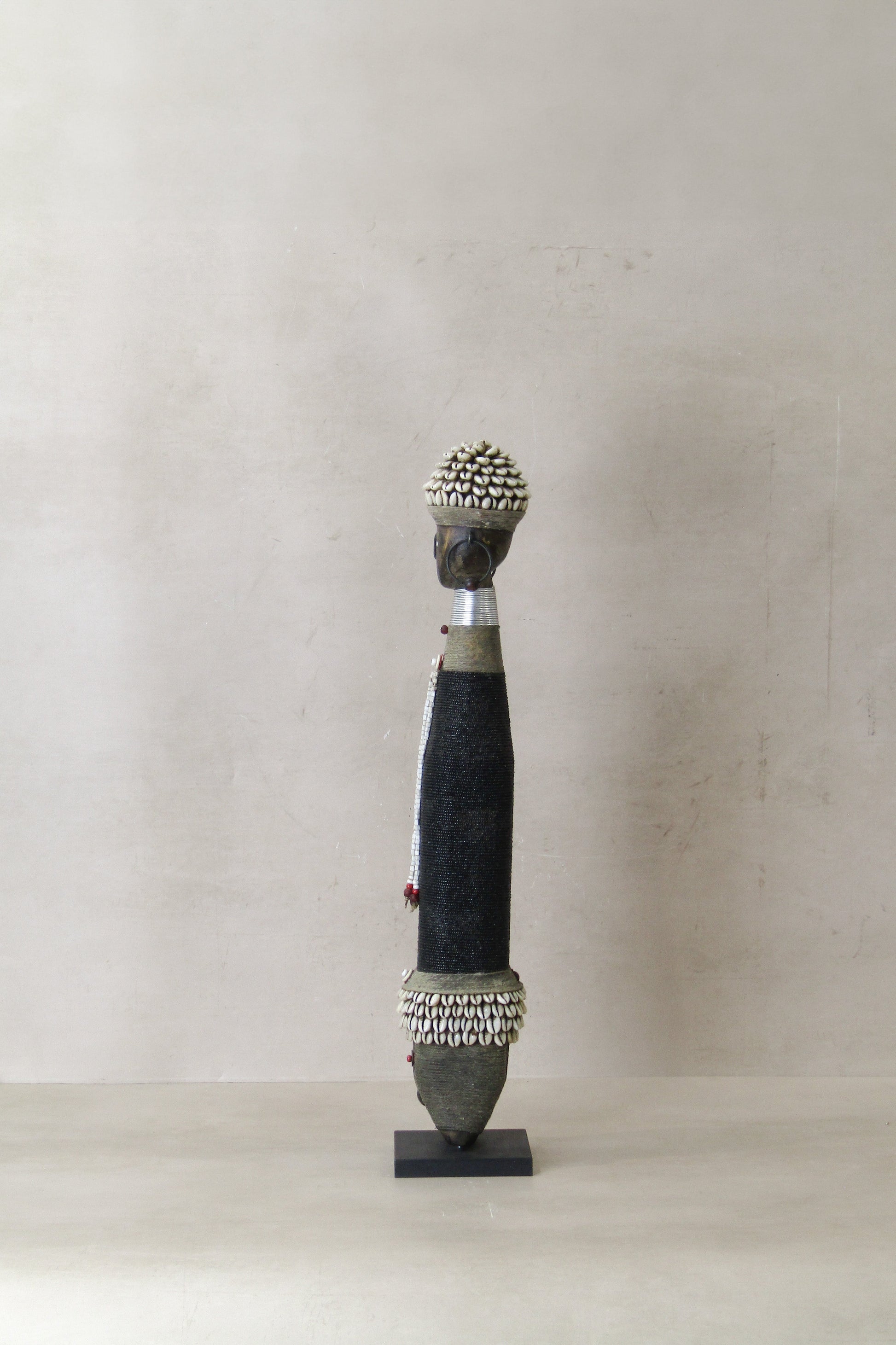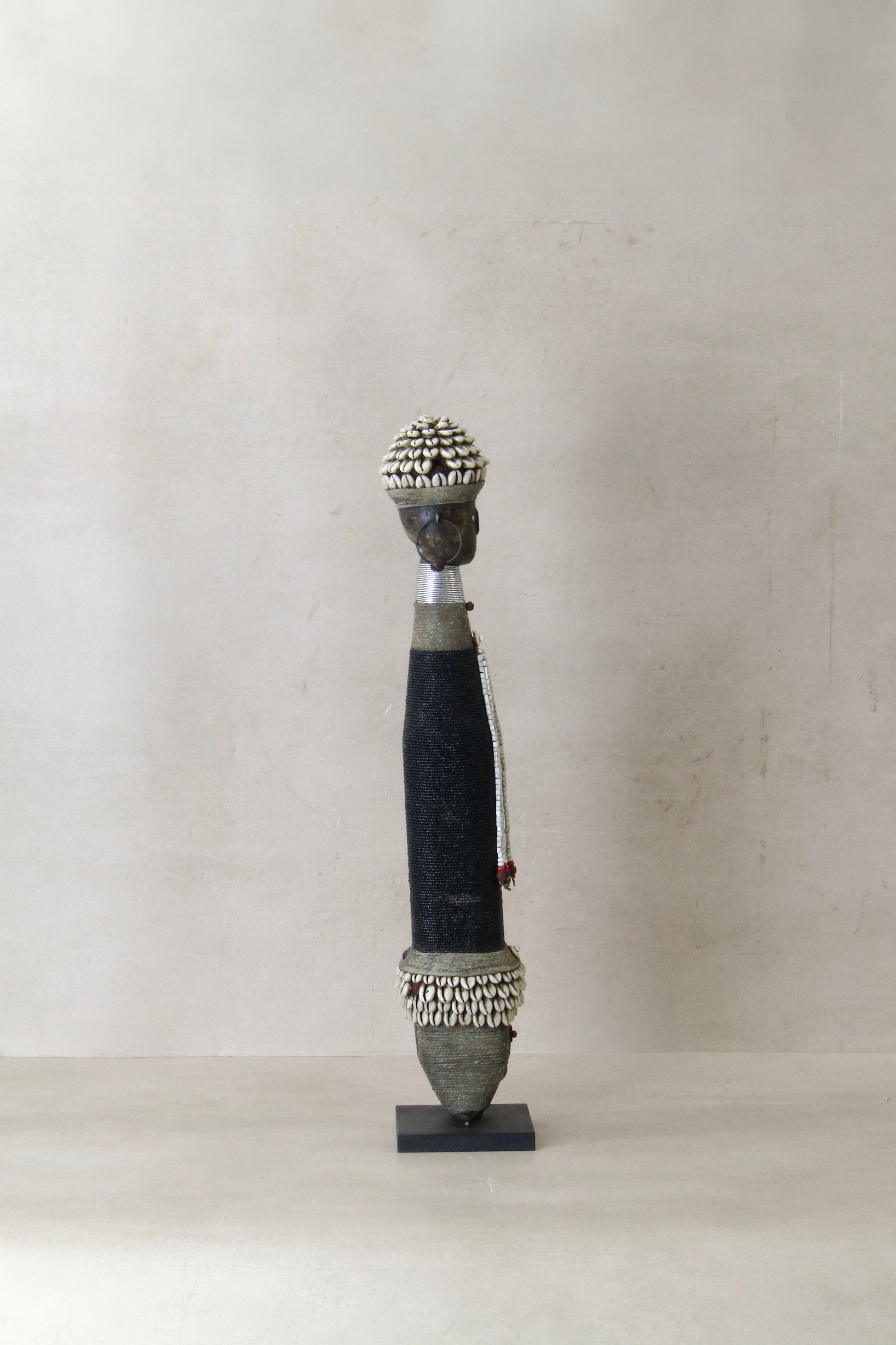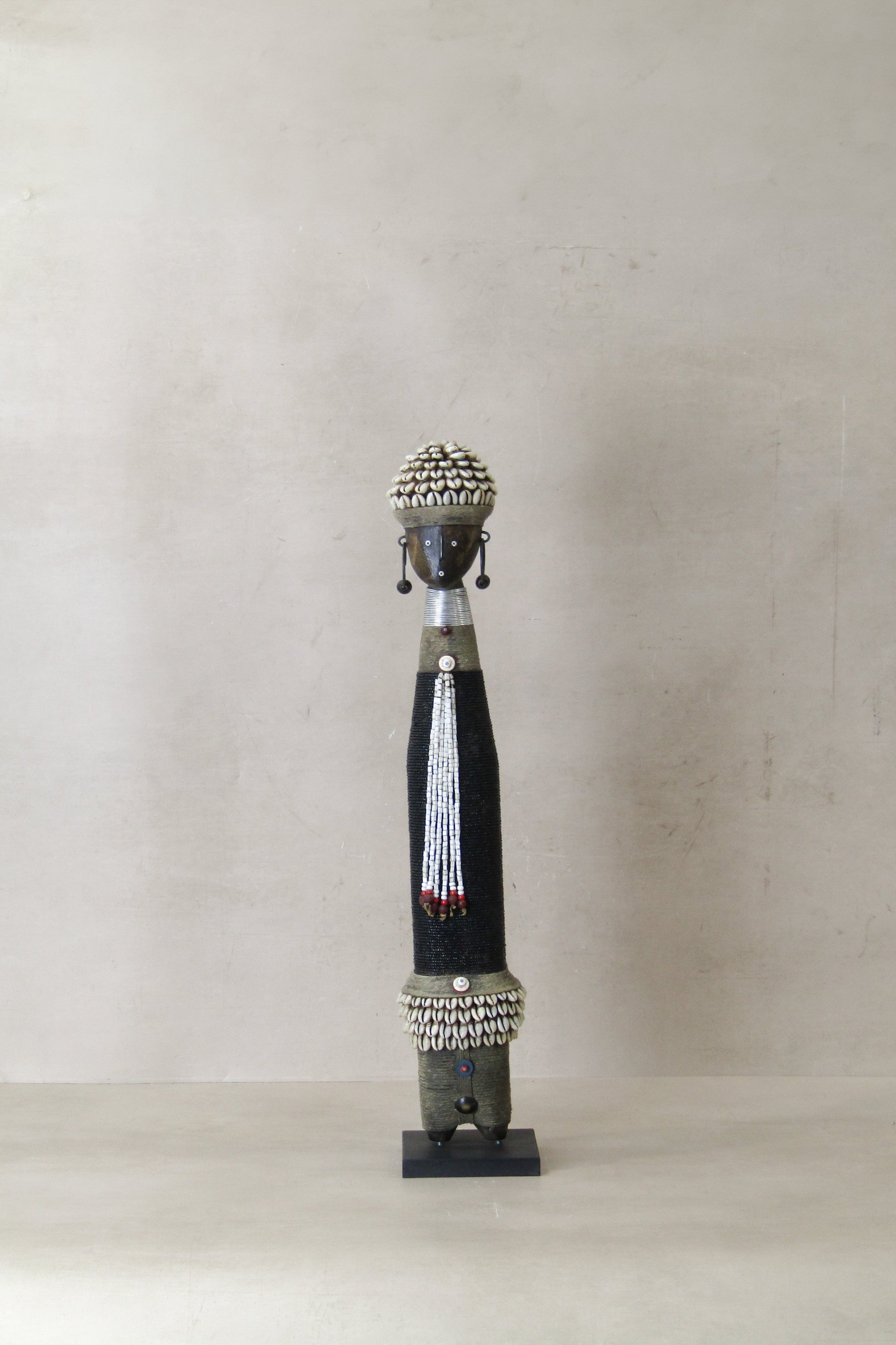 Namchi/Namji dolls are carved from African Rosewood, a legume tree native to the Democratic Republic of Congo, Cameroon, Gabon and Equatorial Guinea. A single block of African Rosewood wood is hand carved into a geometric shape and decorated with multi coloured beads, metals, fibre, cowrie shells, coins, and even leather. Each doll is carved with a unique stature and facial expression. Unadorned dolls made by blacksmiths are played with by young children.