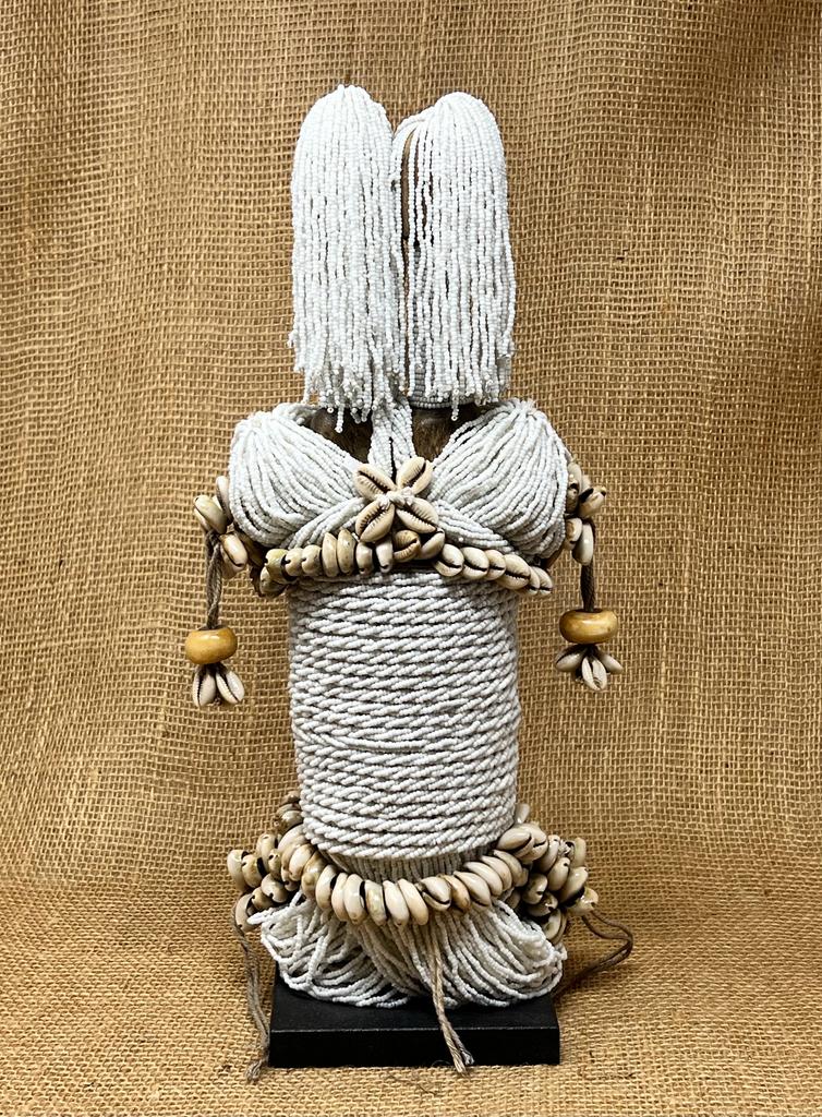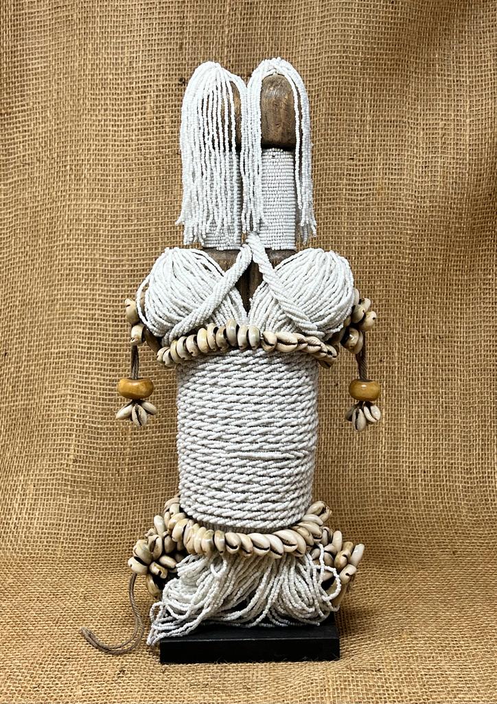 Historical Detail : Namchi/Namji dolls are carved from African Rosewood, a legume tree native to the Democratic Republic of Congo, Cameroon, Gabon and Equatorial Guinea. A single block of African Rosewood wood is hand carved into a geometric shape and decorated with multi coloured beads, metals, fibre, cowrie shells, coins, and even leather. Each doll is carved with a unique stature and facial expression. Unadorned dolls made by blacksmiths are played with by young children.