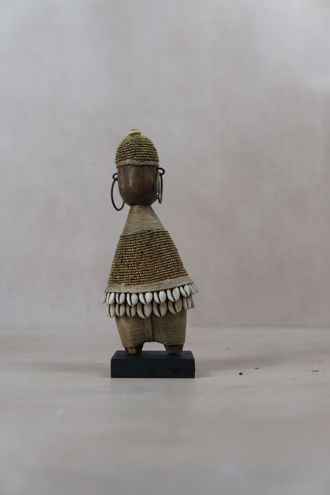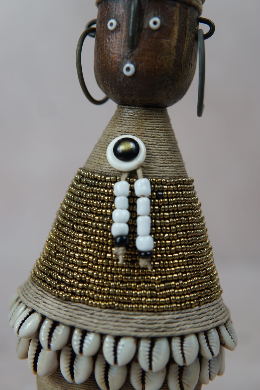 Namchi/Namji dolls are carved from African Rosewood, a legume tree native to the Democratic Republic of Congo, Cameroon, Gabon and Equatorial Guinea. A single block of African Rosewood wood is hand carved into a geometric shape and decorated with multi coloured beads, metals, fibre, cowrie shells, coins, and even leather. Each doll is carved with a unique stature and facial expression. Unadorned dolls made by blacksmiths are played with by young children.