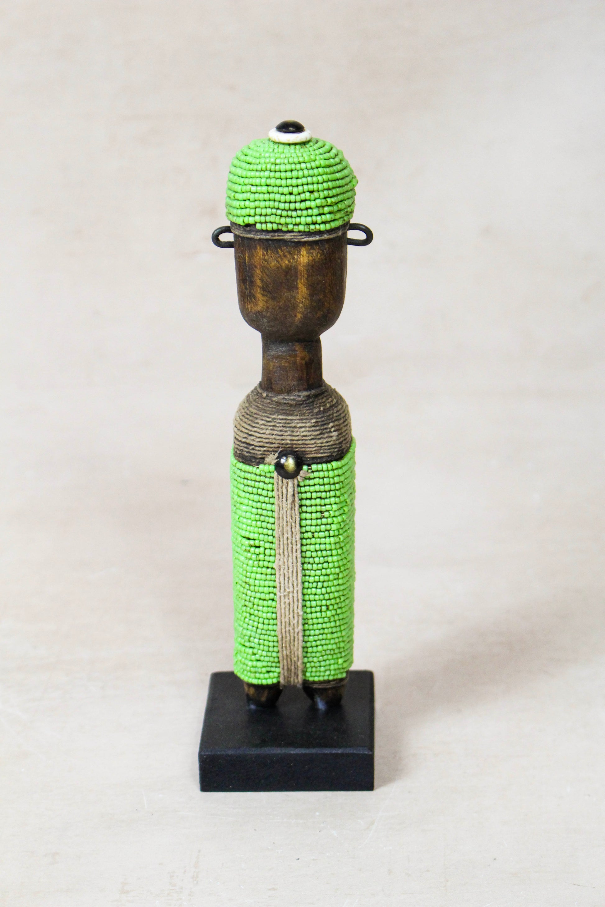 Namchi/Namji dolls are carved from African Rosewood, a legume tree native to the Democratic Republic of Congo, Cameroon, Gabon and Equatorial Guinea. A single block of African Rosewood wood is hand carved into a geometric shape and decorated with multi coloured beads, metals, fibre, cowrie shells, coins, and even leather. Each doll is carved with a unique stature and facial expression. Unadorned dolls made by blacksmiths are played with by young children.