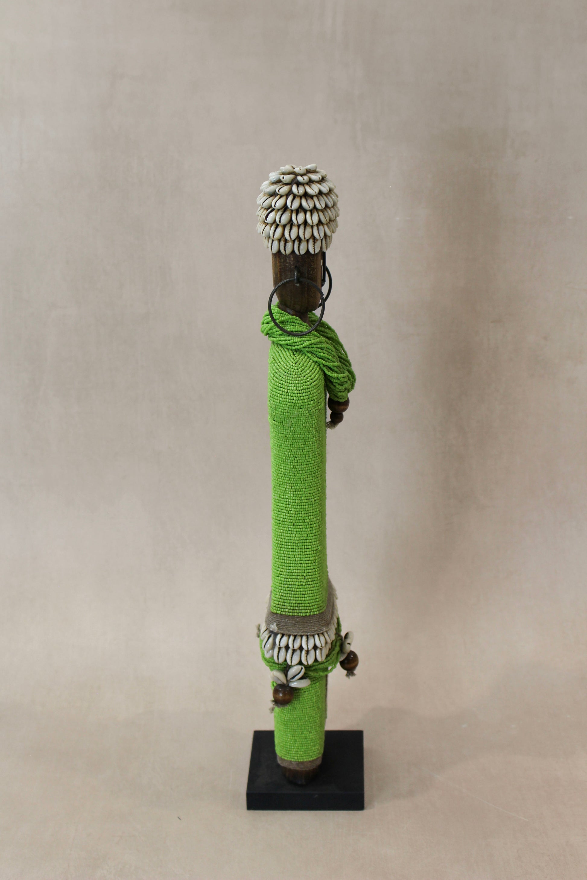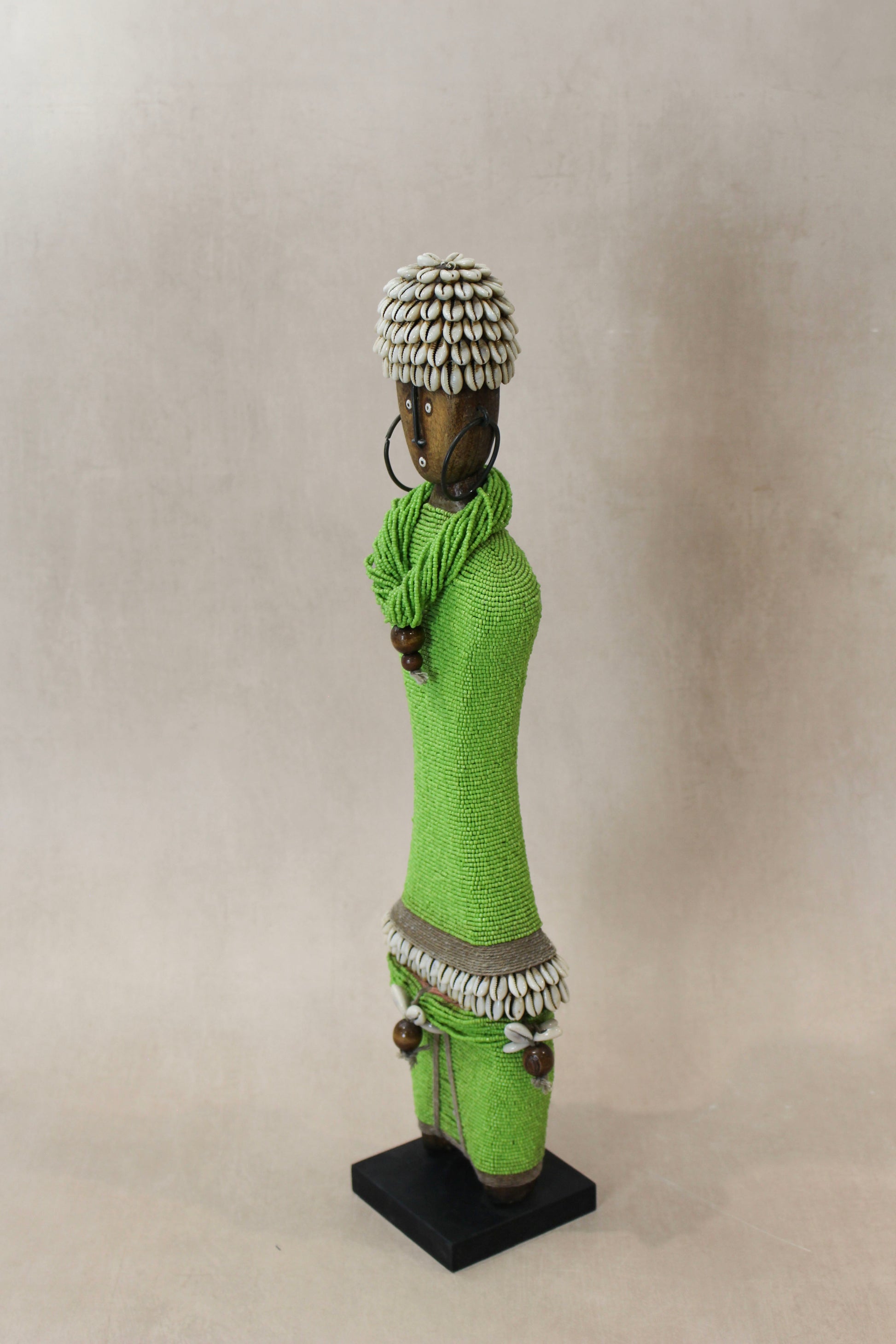 Namchi/Namji dolls are carved from African Rosewood, a legume tree native to the Democratic Republic of Congo, Cameroon, Gabon and Equatorial Guinea. A single block of African Rosewood wood is hand carved into a geometric shape and decorated with multi coloured beads, metals, fibre, cowrie shells, coins, and even leather. Each doll is carved with a unique stature and facial expression. Unadorned dolls made by blacksmiths are played with by young children.
