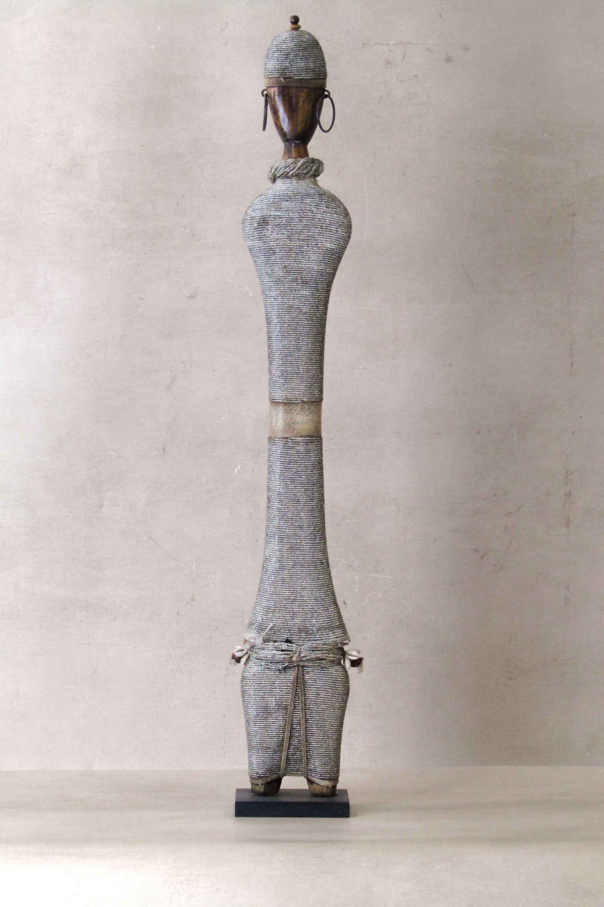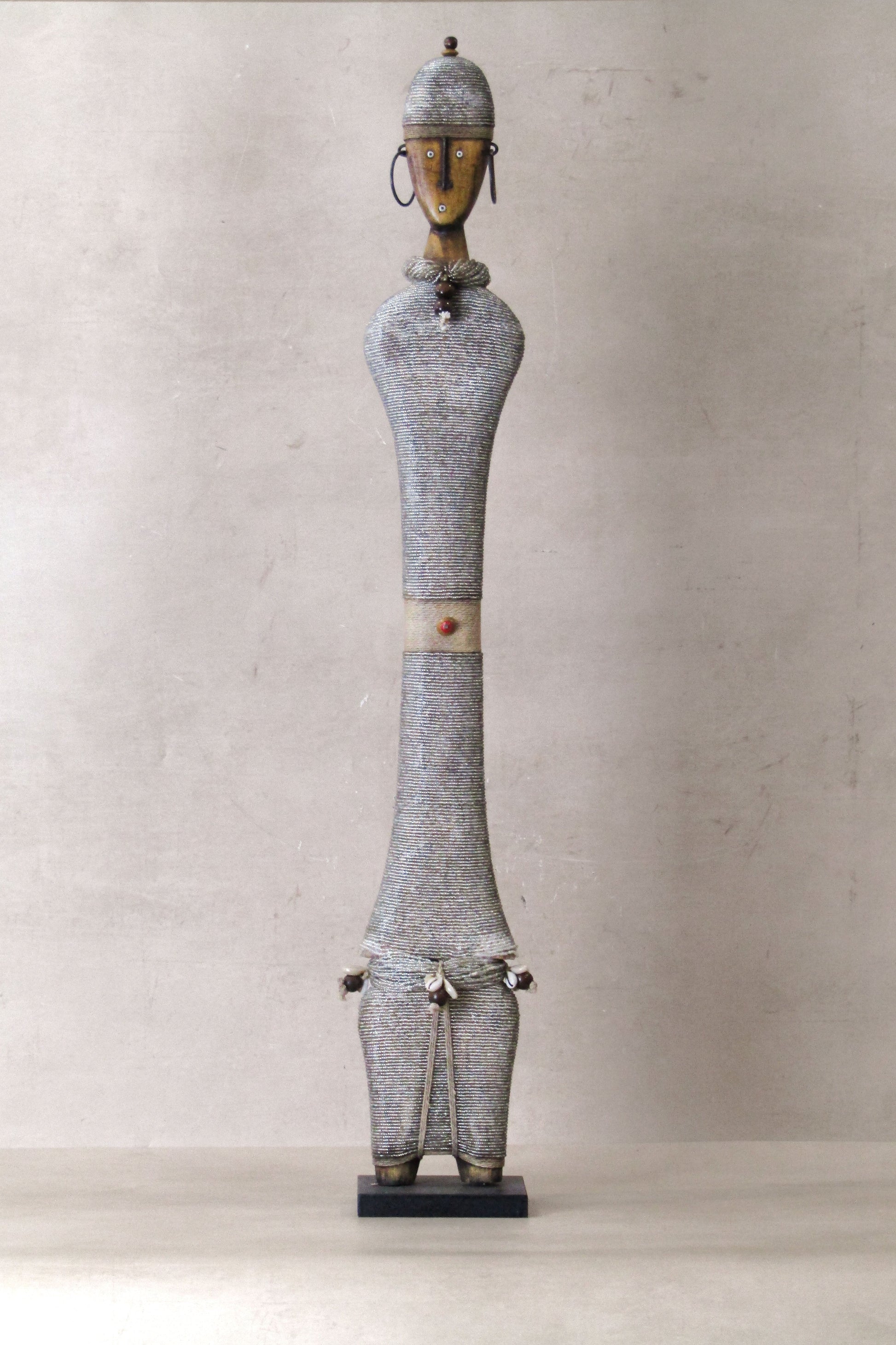 Namchi/Namji dolls are carved from African Rosewood, a legume tree native to the Democratic Republic of Congo, Cameroon, Gabon and Equatorial Guinea. A single block of African Rosewood wood is hand carved into a geometric shape and decorated with multi coloured beads, metals, fibre, cowrie shells, coins, and even leather. Each doll is carved with a unique stature and facial expression. Unadorned dolls made by blacksmiths are played with by young children.