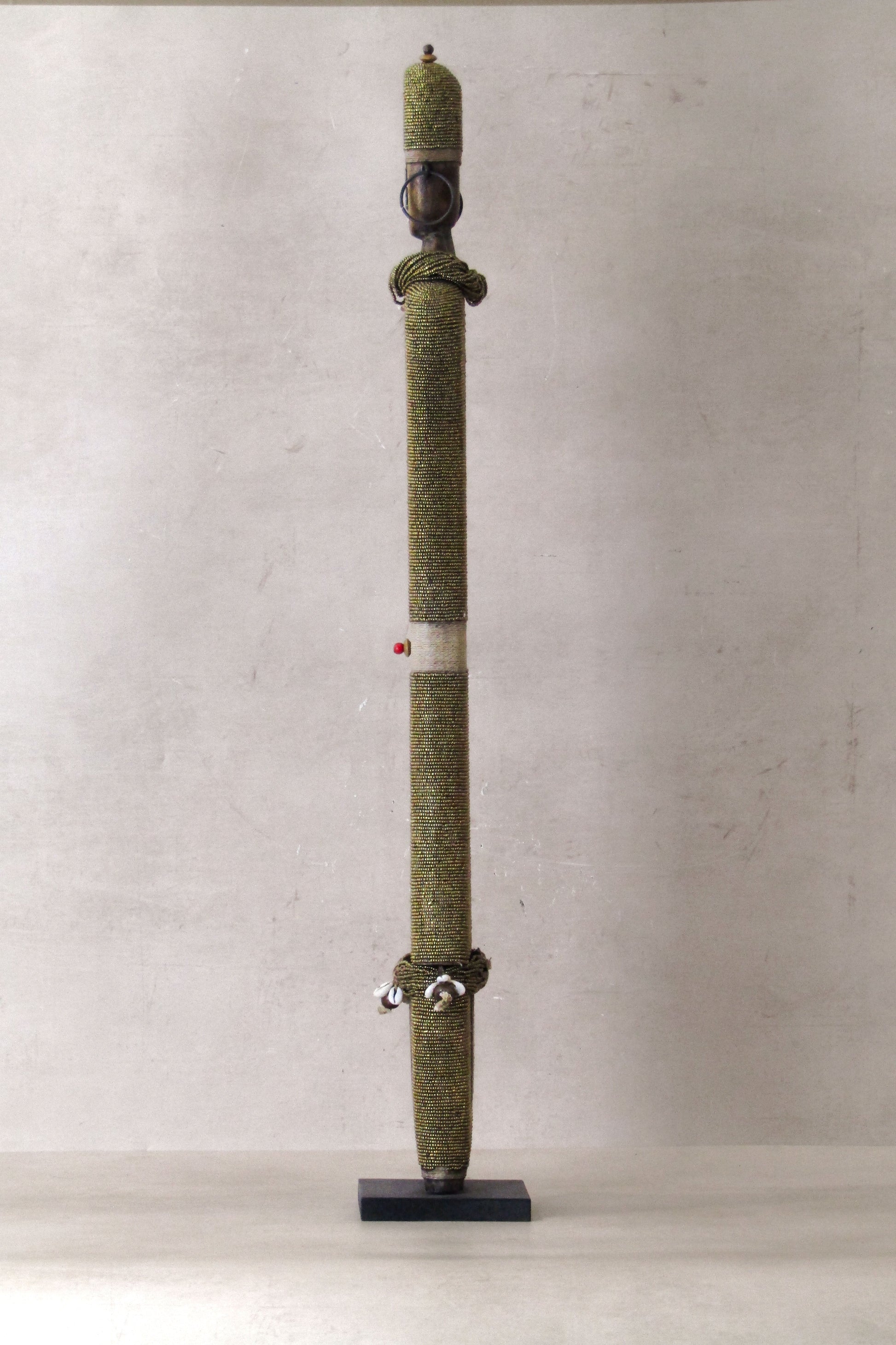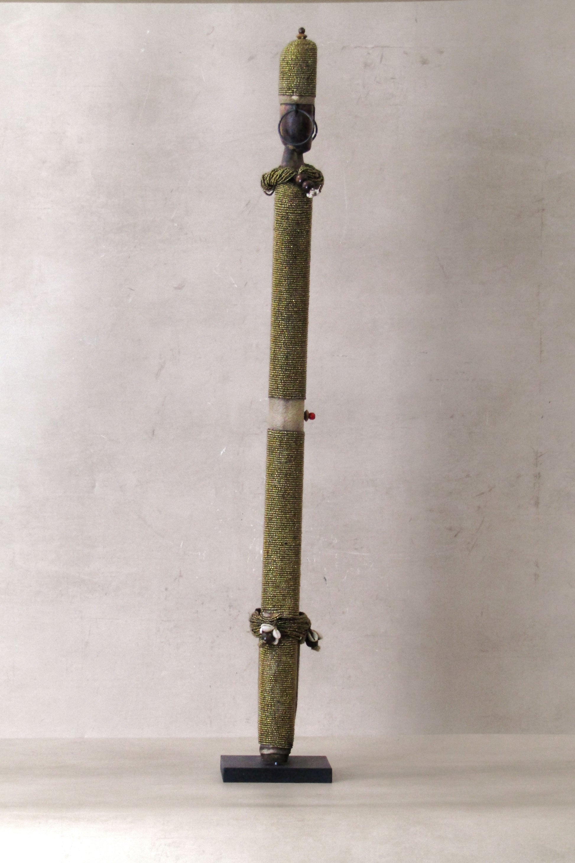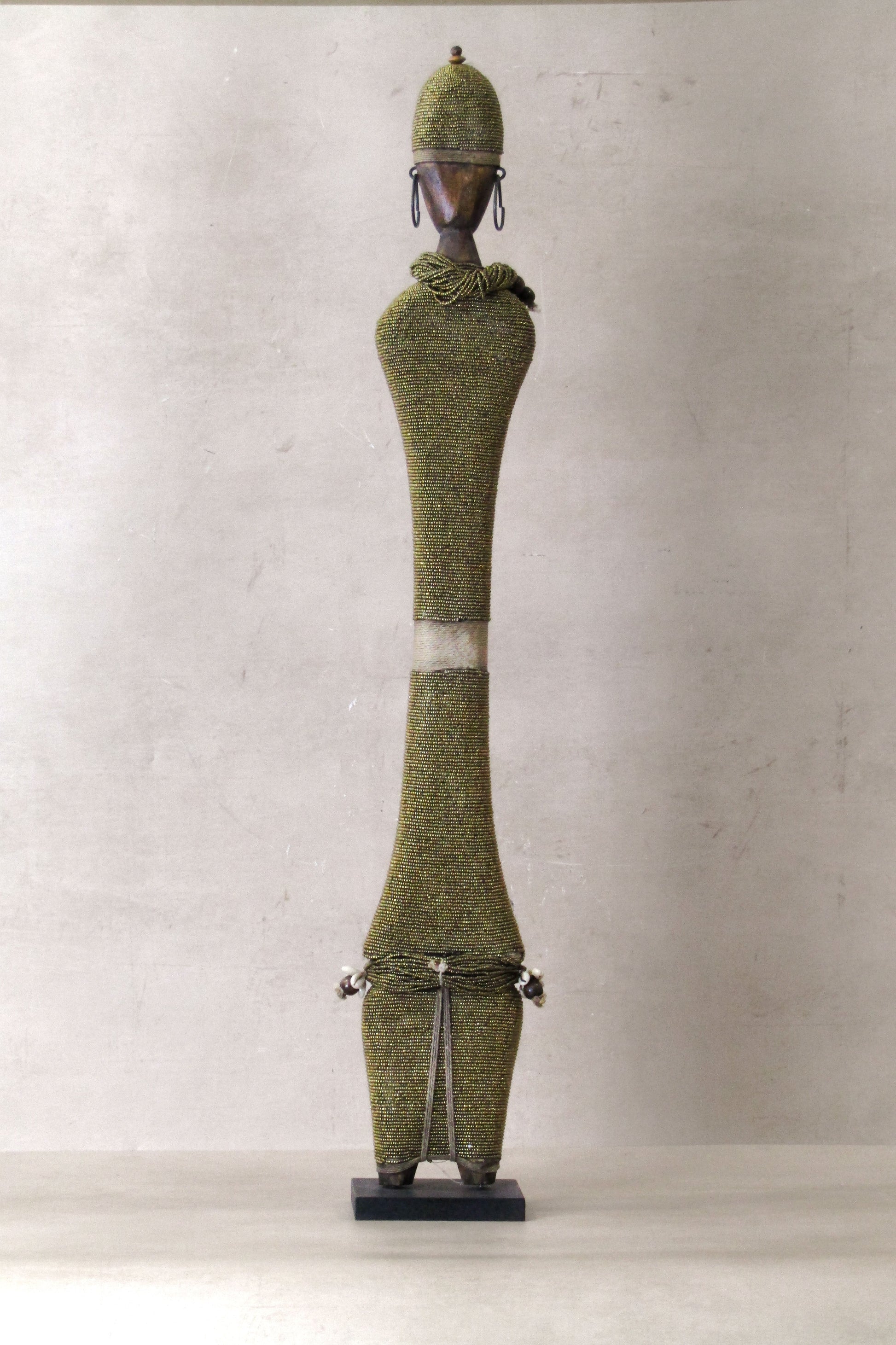 Namchi/Namji dolls are carved from African Rosewood, a legume tree native to the Democratic Republic of Congo, Cameroon, Gabon and Equatorial Guinea. A single block of African Rosewood wood is hand carved into a geometric shape and decorated with multi coloured beads, metals, fibre, cowrie shells, coins, and even leather. Each doll is carved with a unique stature and facial expression. Unadorned dolls made by blacksmiths are played with by young children.