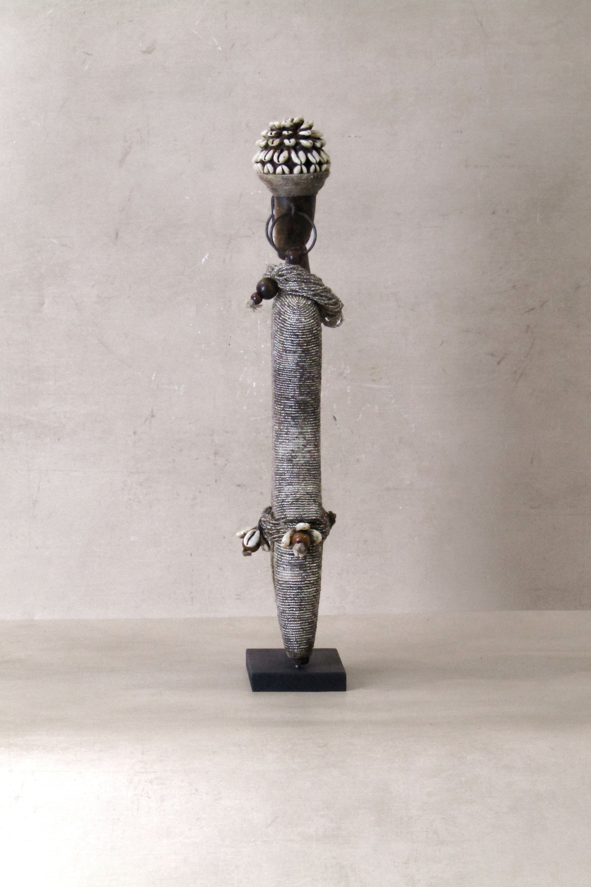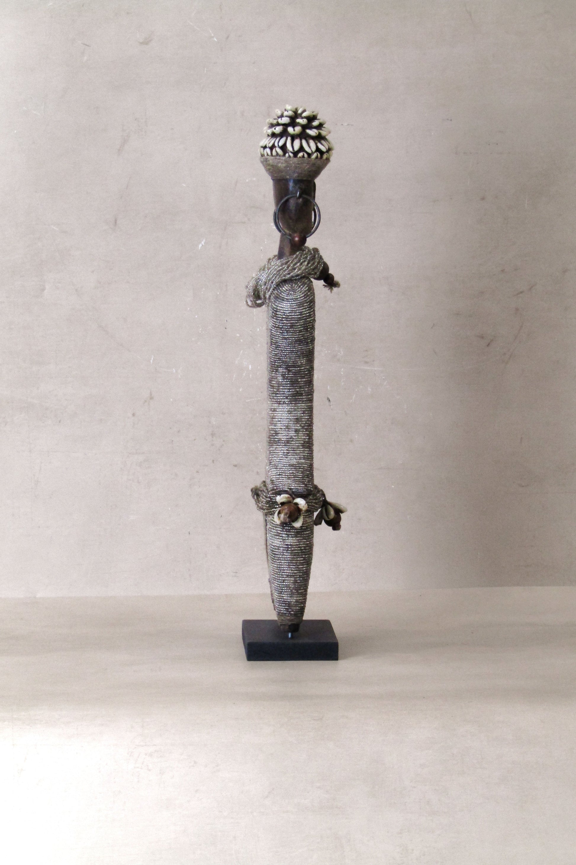Namchi/Namji dolls are carved from African Rosewood, a legume tree native to the Democratic Republic of Congo, Cameroon, Gabon and Equatorial Guinea. A single block of African Rosewood wood is hand carved into a geometric shape and decorated with multi coloured beads, metals, fibre, cowrie shells, coins, and even leather. Each doll is carved with a unique stature and facial expression. Unadorned dolls made by blacksmiths are played with by young children.