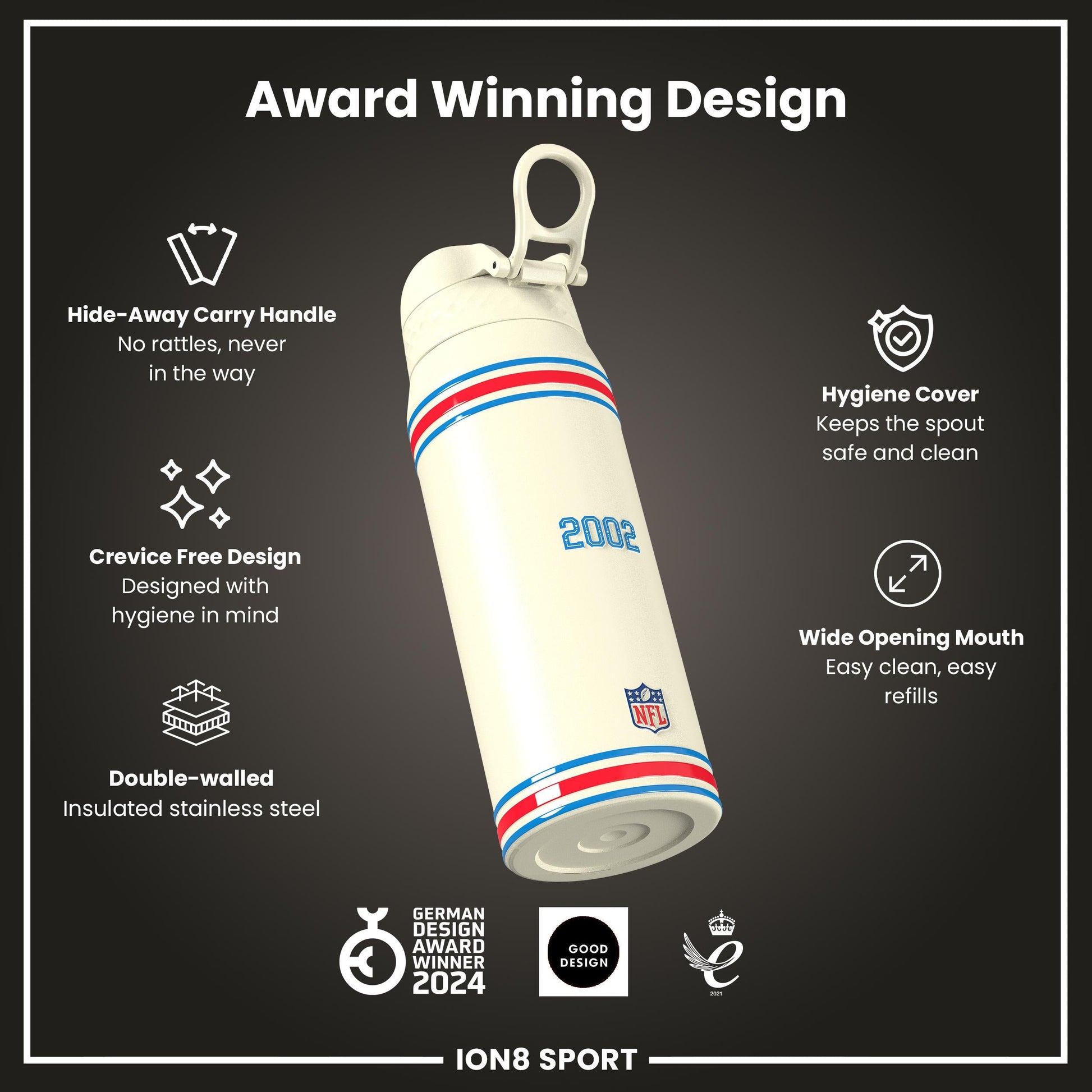 Raise your game with the Official NFL Thermal Insulated Bottle by ION8. Designed to meet the uncompromising standards of NFL, this 750ml double-wall stainless steel bottle combines premium performance with unmistakable NFL pride.