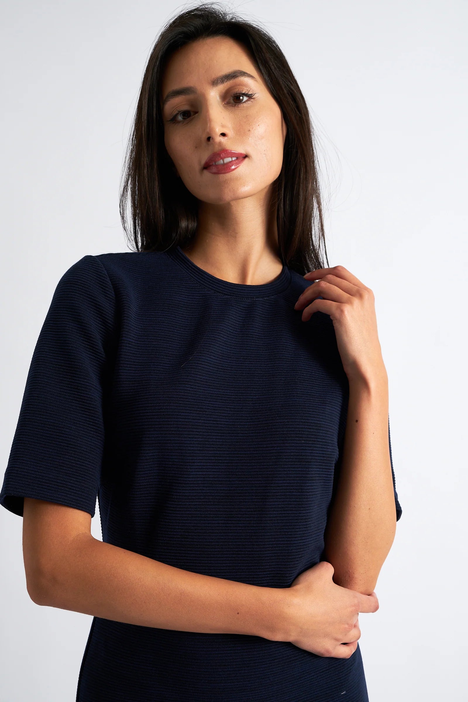 Make an unforgettable entrance with the Nila Rib bodycon midi dress in navy. This dress features short sleeves and an exposed antique brass back zip with a charming ribbon pull. Perfect for making a stunning impression!