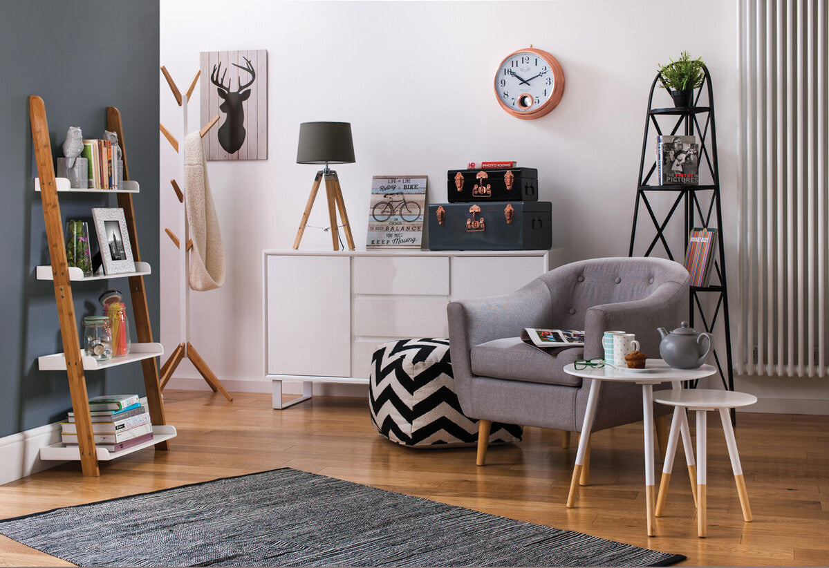 This shelf ladder unit features a minimalist look with its sleek frame and four shelves. The ladder unit has a renewable wooden frame in natural finish that boasts vivid grains offering an organic charm to your interior. The four hi-gloss white shelves have a recessed surface and open front that keeps the contents safe and visible simultaneously making it ideal for displaying plants and decor accents.