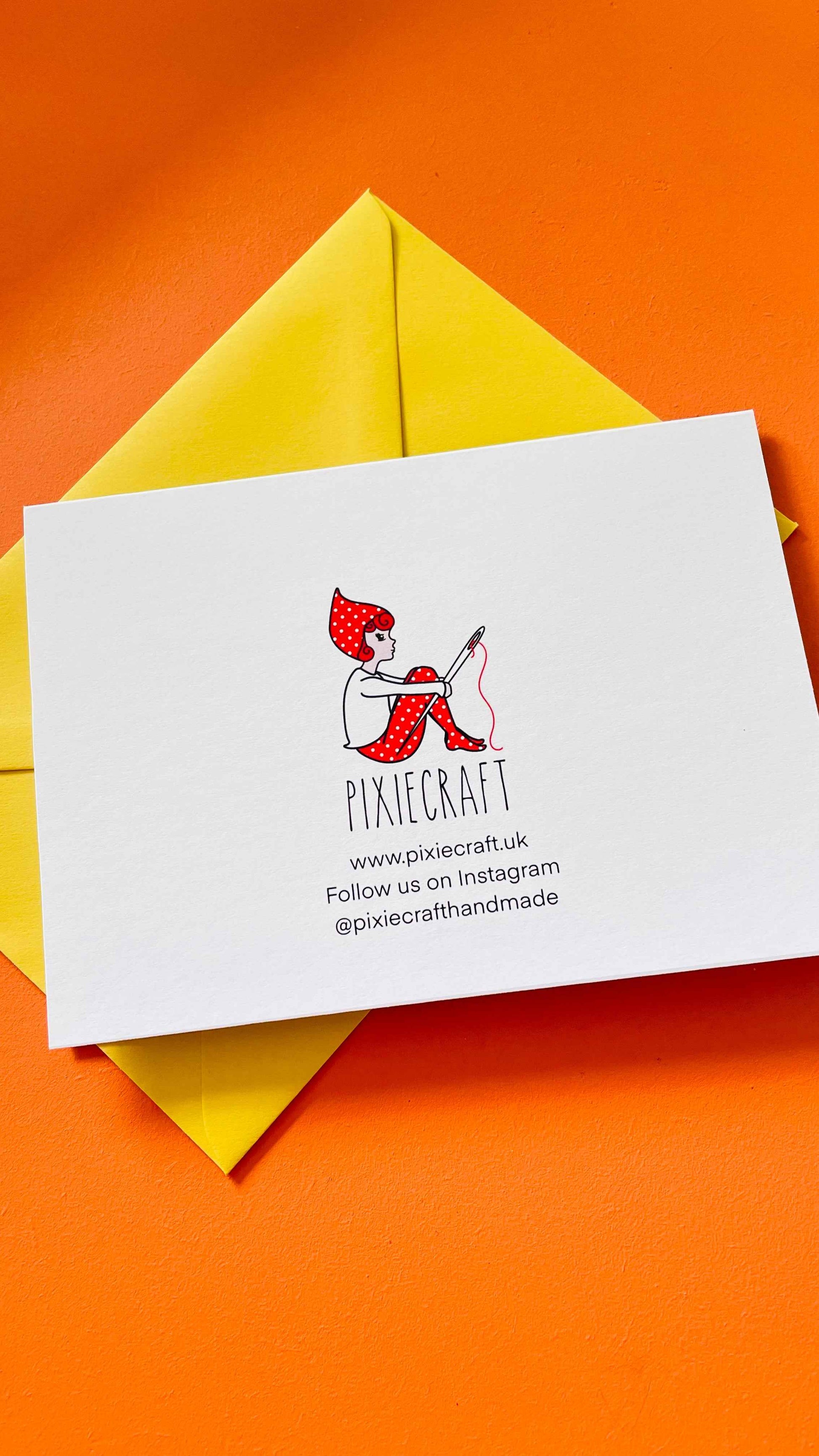 Original Illustration by Pixiecraft. This card measures approx A6 in size, is blank on the inside for your message and comes with a co-ordinating colourful recycled paper envelope.