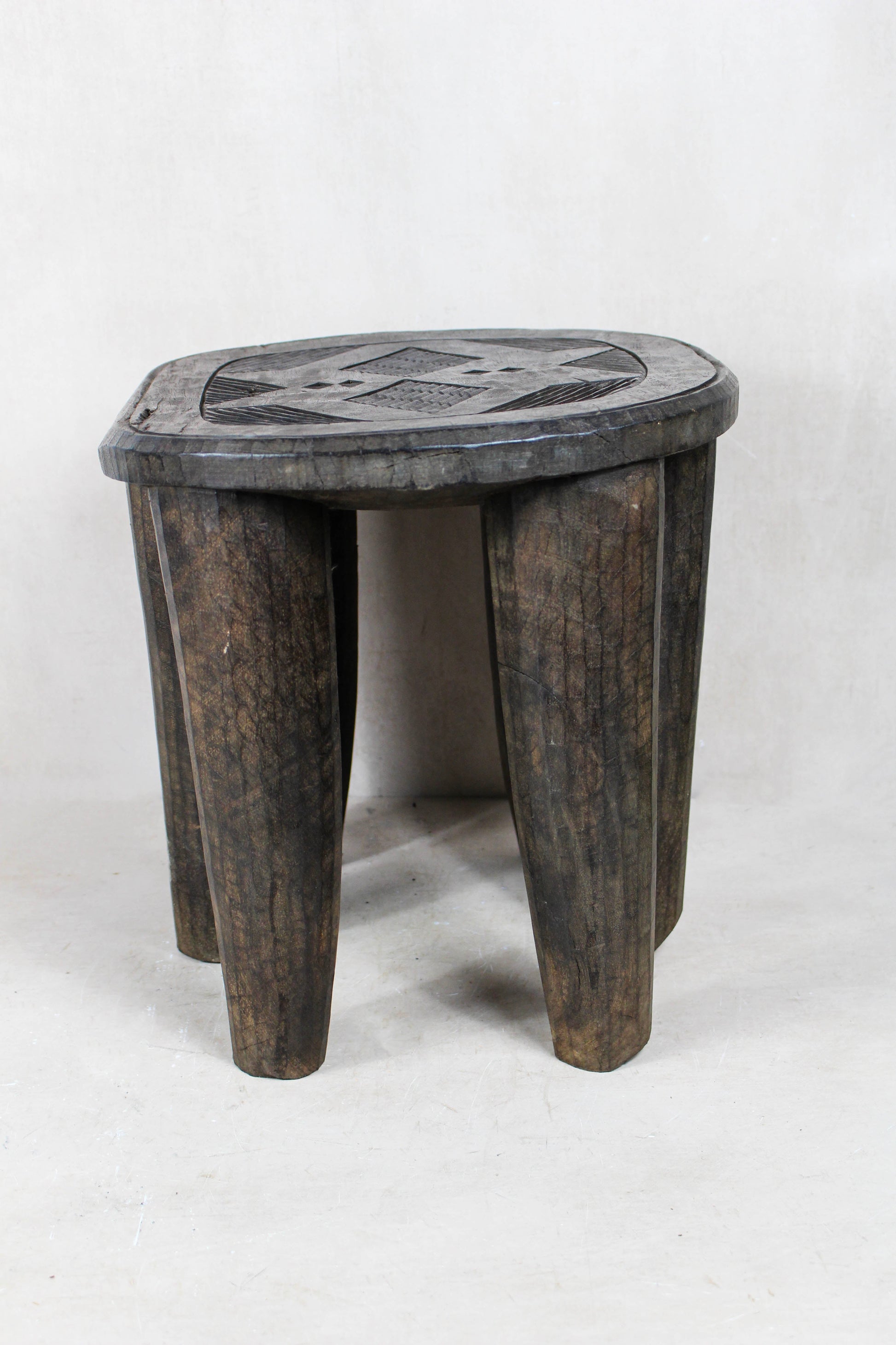 Each stool is a sculptural feat, hand-carved from a single, seamless block of indigenous hardwood. The geometric precision of the legs and the subtle, incised patterns on the surface reflect a design language unique to the Nupe people. Having been weathered by time and restored with care, this piece retains "perfect imperfections"—a historical patina that tells a story of communal life and the passage of time. A truly one-of-a-kind functional art piece for the modern, soulful home.