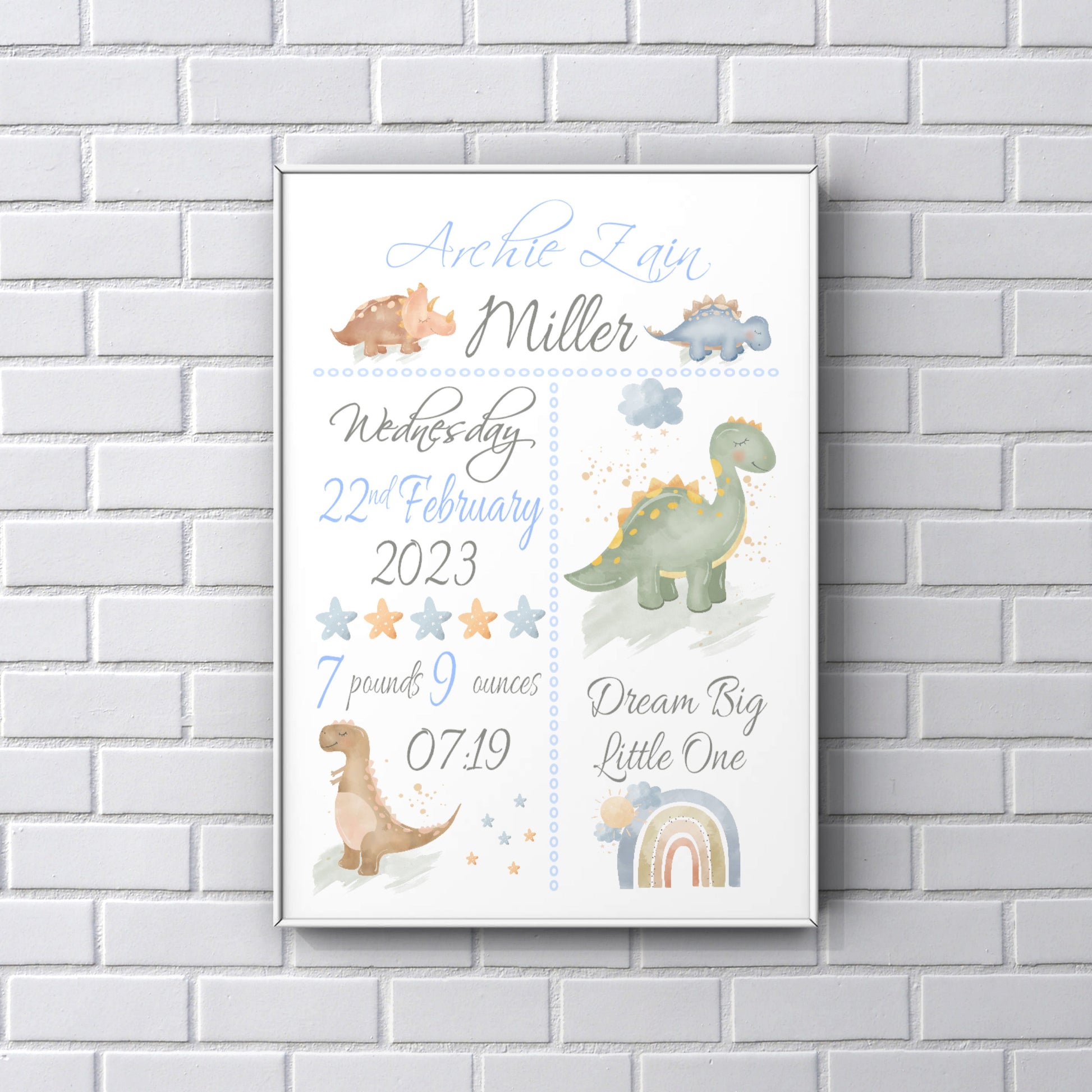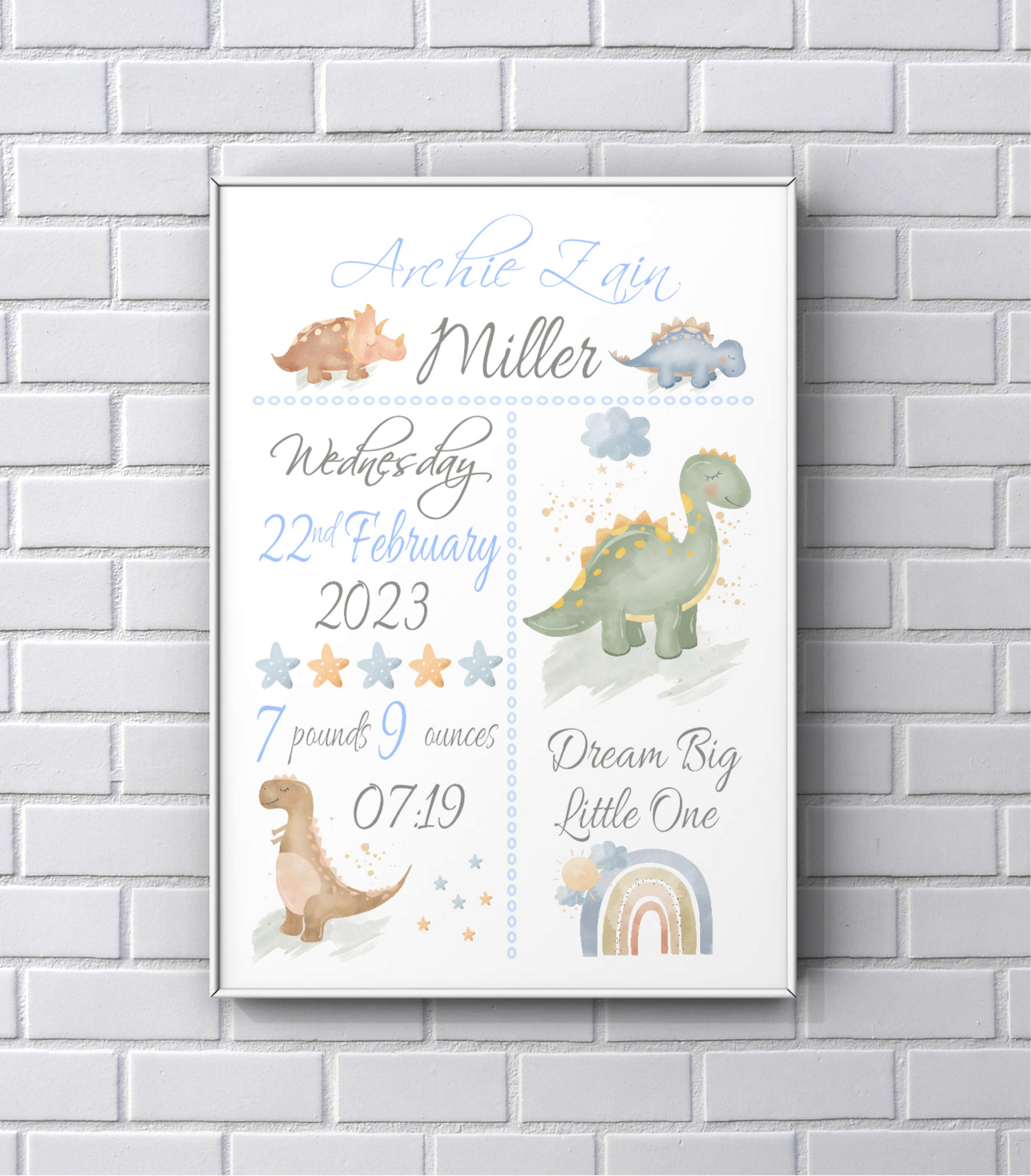 This adorable dinosaur birth print is the perfect way to celebrate the arrival of a little boy! Featuring charming and pastel coloured dinosaurs with playful details, this print captures the excitement and wonder of a new beginning. The design combines whimsical elements with a sense of adventure, symbolizing the strength and curiosity that will grow alongside your child. Personalised with birth details, this print serves as a timeless keepsake, marking the moment your little one arrived and adding a touch of fun and joy to his nursery or bedroom.