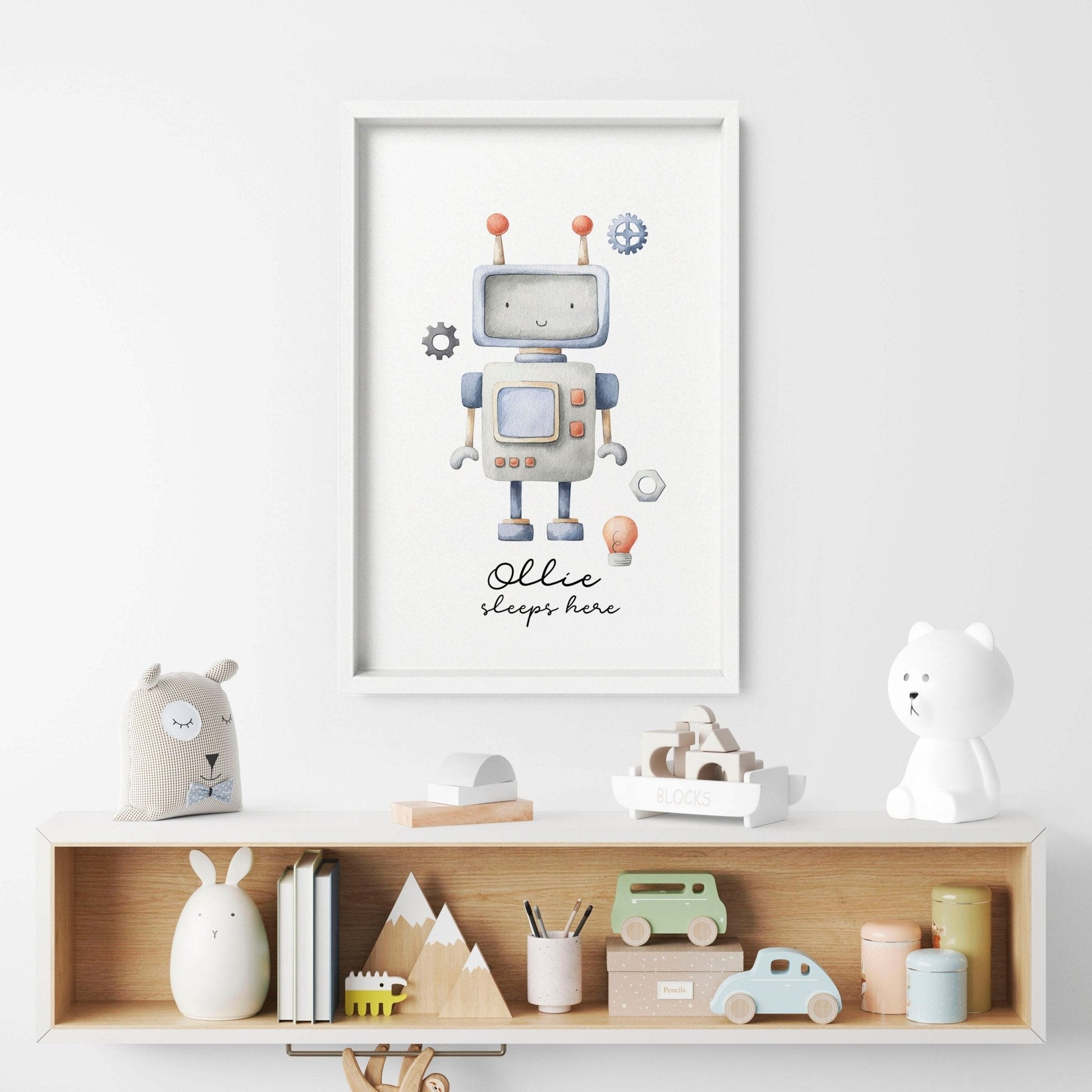Create an enchanting and adventurous atmosphere in your baby boy's nursery or playroom with our Nursery room decor wall art. This charming artwork adds a touch of whimsy to the space, featuring watercolour vintage-style robot toys.