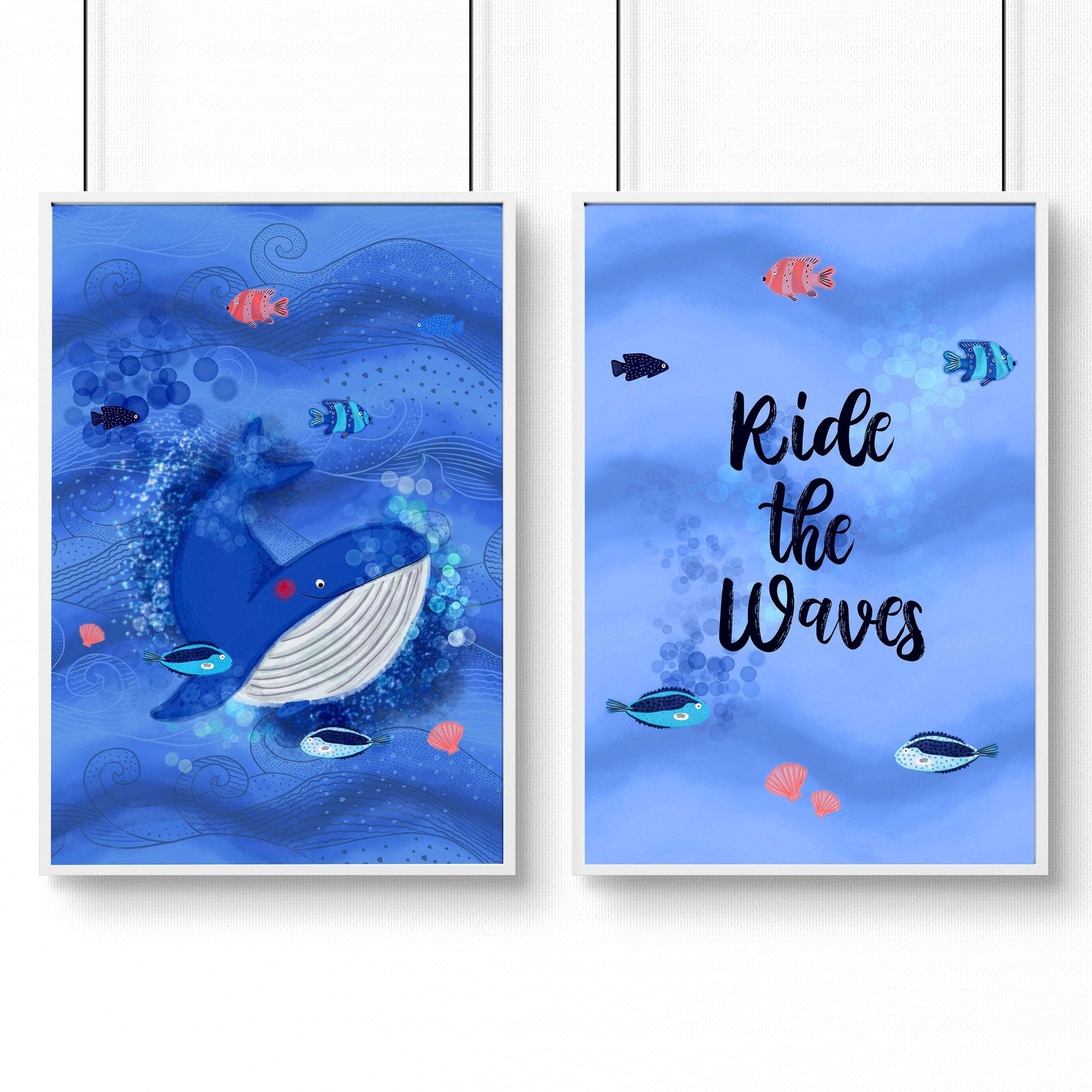 Finally, create an enchanting ocean theme in your playroom, nursery, or baby boy's room with our delightful set of two wall art prints. Let the soothing blue tones, captivating illustrations, and inspiring "Ride the Waves" quote transport your child to a world of underwater wonder and endless possibilities.
