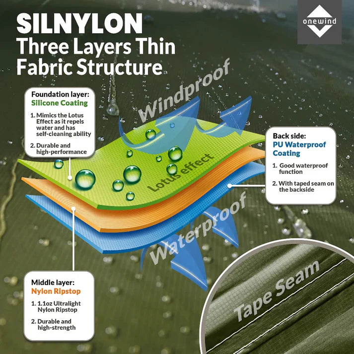 Made from 1.1oz Silnylon Ripstop, the tarp is not only abrasion-resistant but also remarkably light at just 1 lb. 12oz. Its silicone/PU 4000mm waterproof coating ensures that you stay dry in various weather conditions, emulating the water-repelling properties of a lotus leaf.