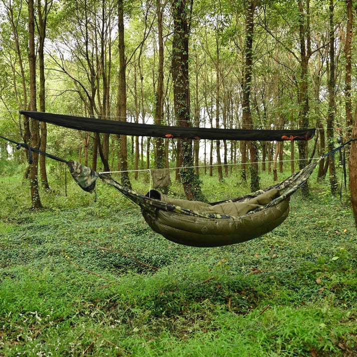 Easily collect and set up your tarp for outdoor camping. The mesh design, noted for its unique breathability, provides an alternative storage solution for tarps, distinct from the snake skin sleeve.