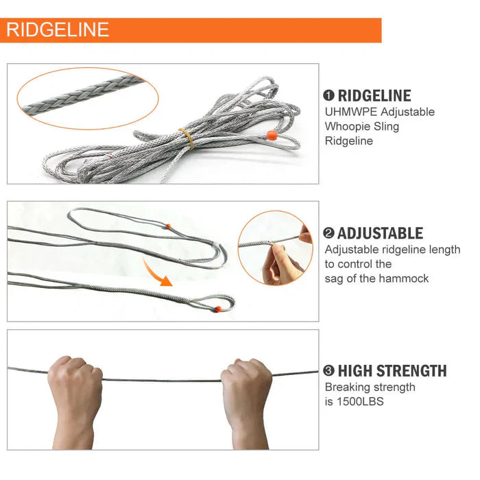 Adjustable Ridgeline for Perfect Sag – Customize your hang with a 1500-lb UHMWPE ridgeline, included shock cords, and stakes. The 11’ (64”) or 12’ (68”) bed accommodates tall users, while the double-sided stuff sack keeps gear clean and off the ground.