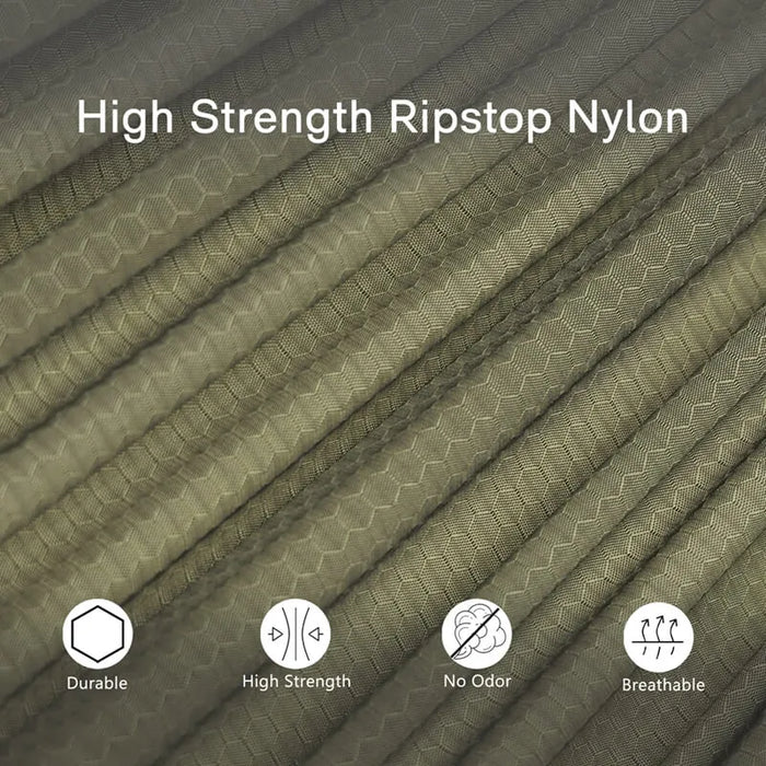 Storm-Ready Versatility – The 70D hexagon ripstop (12ft model) and reinforced seams withstand wind and abrasion. Use the bug net as a gear loft, stake guylines for stability, or pair with an underquilt for cold-weather hammock camping.