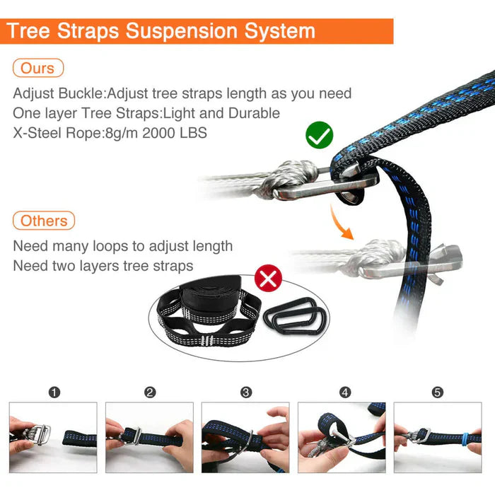 Ultralight & Complete Camping System – Weighing just 2.1 lbs (11ft) or 2.4 lbs (12ft), this kit includes tree straps, stakes, and bugnet. Packs to 11”x5.5” for effortless backpacking—no extra gear needed.