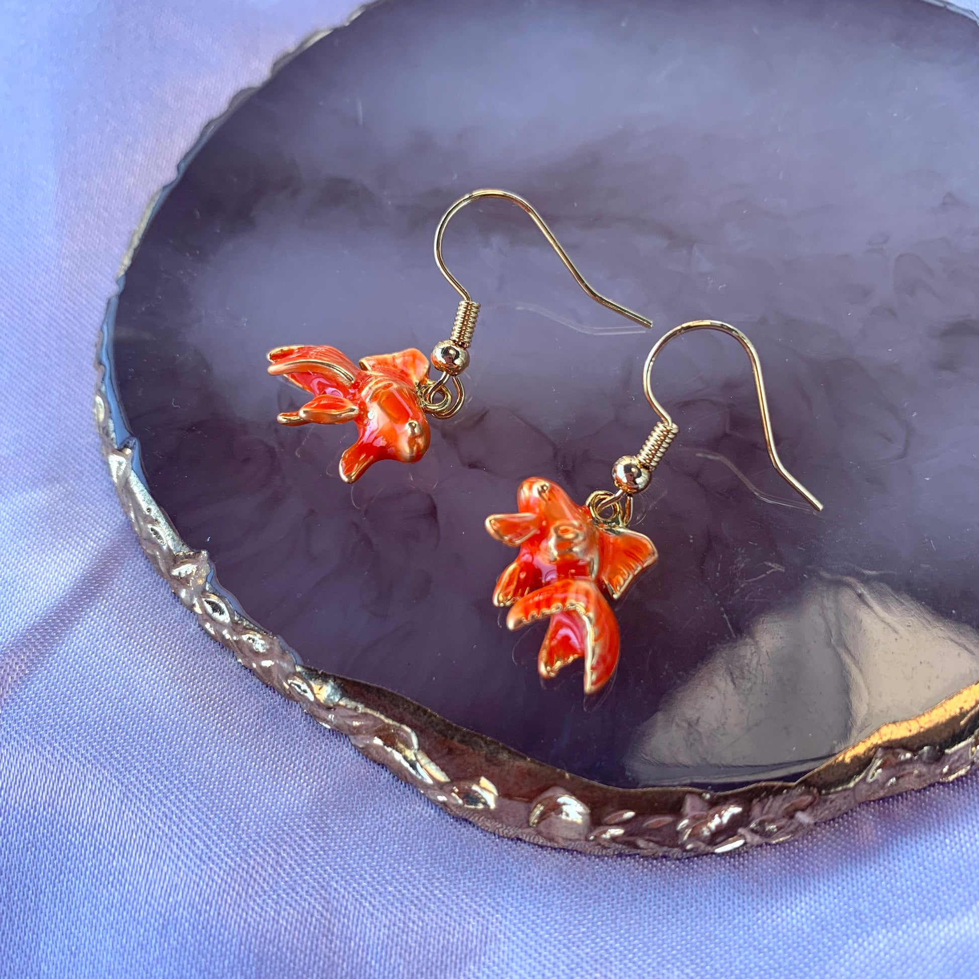 A cool pair of orange fantail fish earrings on 18k gold plated hooks.