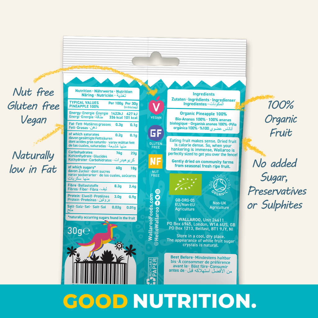 Bite sized naturally sweet organic pineapple pieces with a juiciness that comes through in a burst of flavour. Box of 10x30g individual bags.