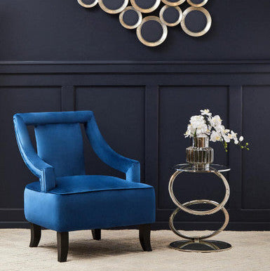 The base features interconnecting circles that add sculptural movement, while the round mirrored glass tabletop introduces a subtle glow that complements contemporary interiors. This clear glass end table delivers a clean and versatile surface without crowding your layout.
