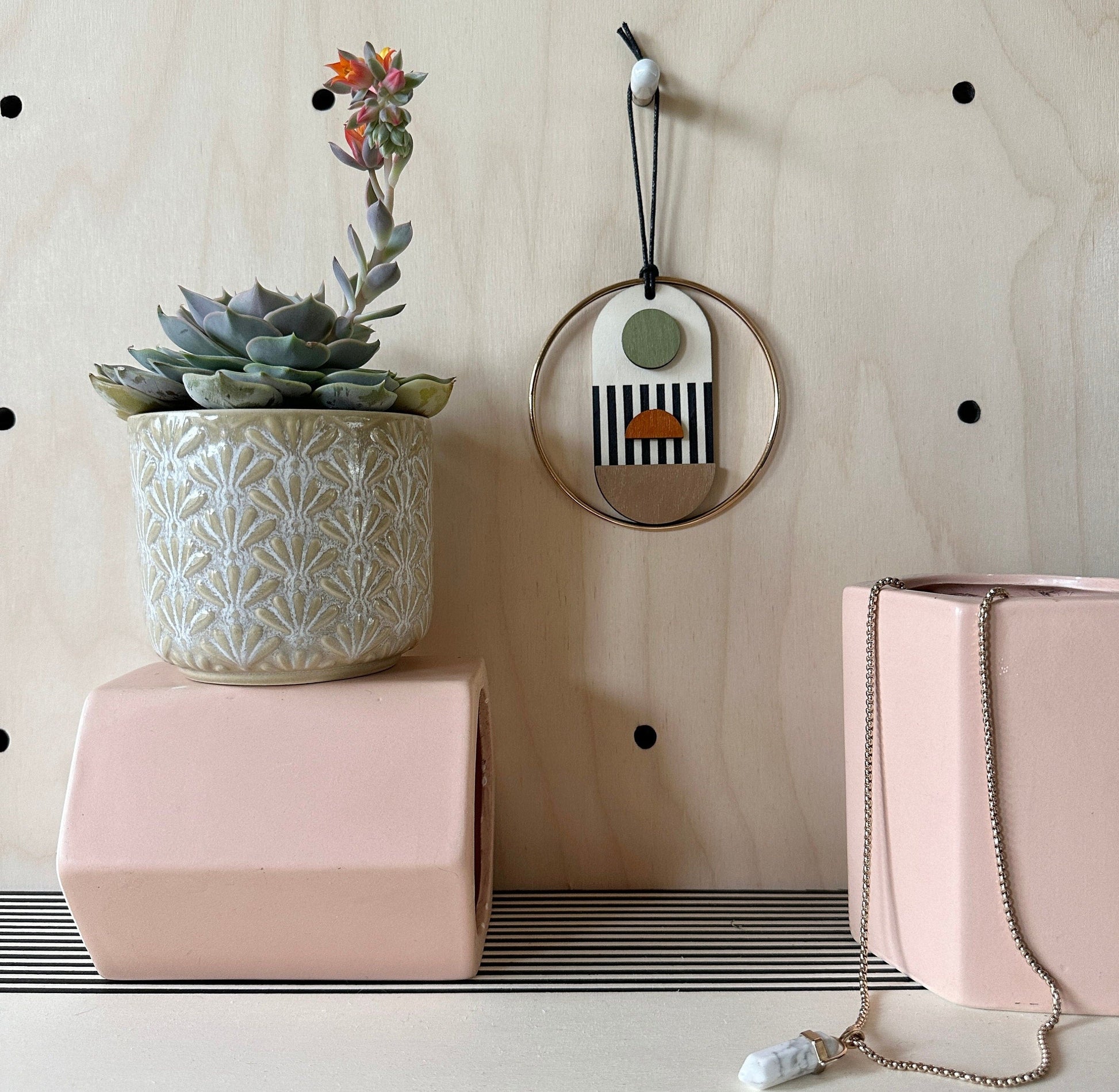 Lovingly handmade modern mini wall art. These decorations are made from plywood, paint, metal and waxed cord. The colours used are a burnt orange, olive green, black, beige and gold. This mini wall hanging would make a beautiful addition to any room to create a modern mid-century feel. Made from sustainable plywood, hand painted and constructed in Milton Keynes, England.