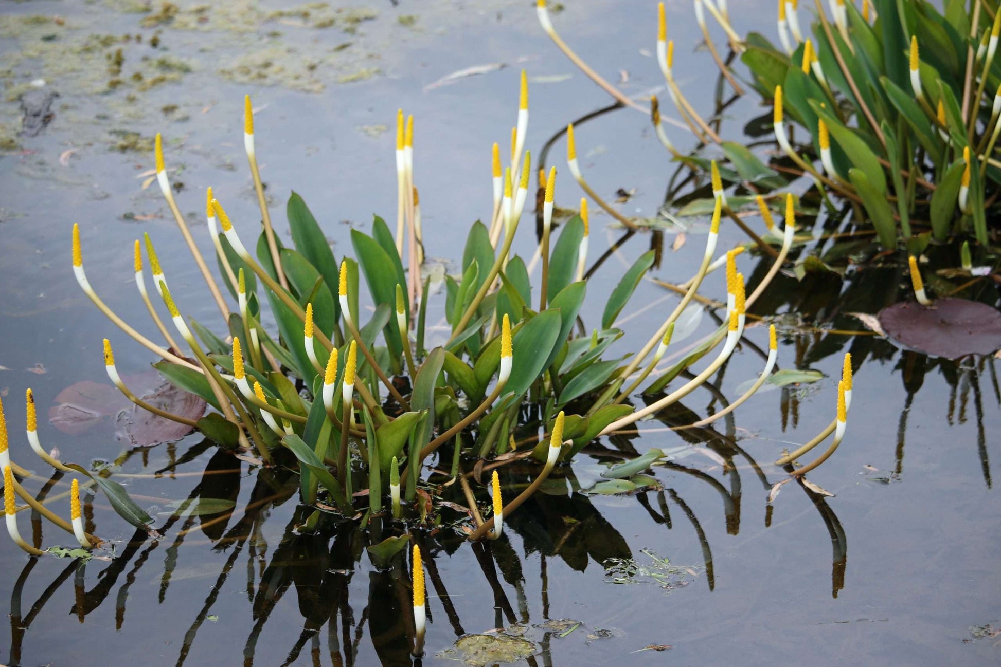 Orontium aquaticum typically grows to a height of 30–60 cm (12–24 inches), with long, narrow, leathery leaves that resemble those of a water lily. The leaves are lance-shaped, bright green, and have a prominent central vein. The plant forms a rosette of these leaves at the water's surface, where they float, or partially submerge, depending on water levels.