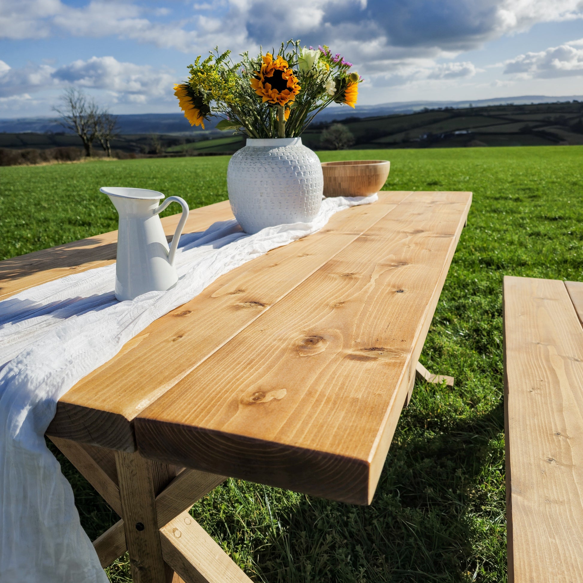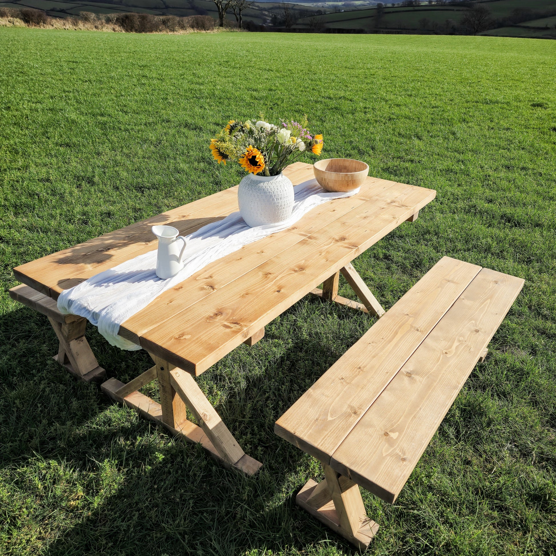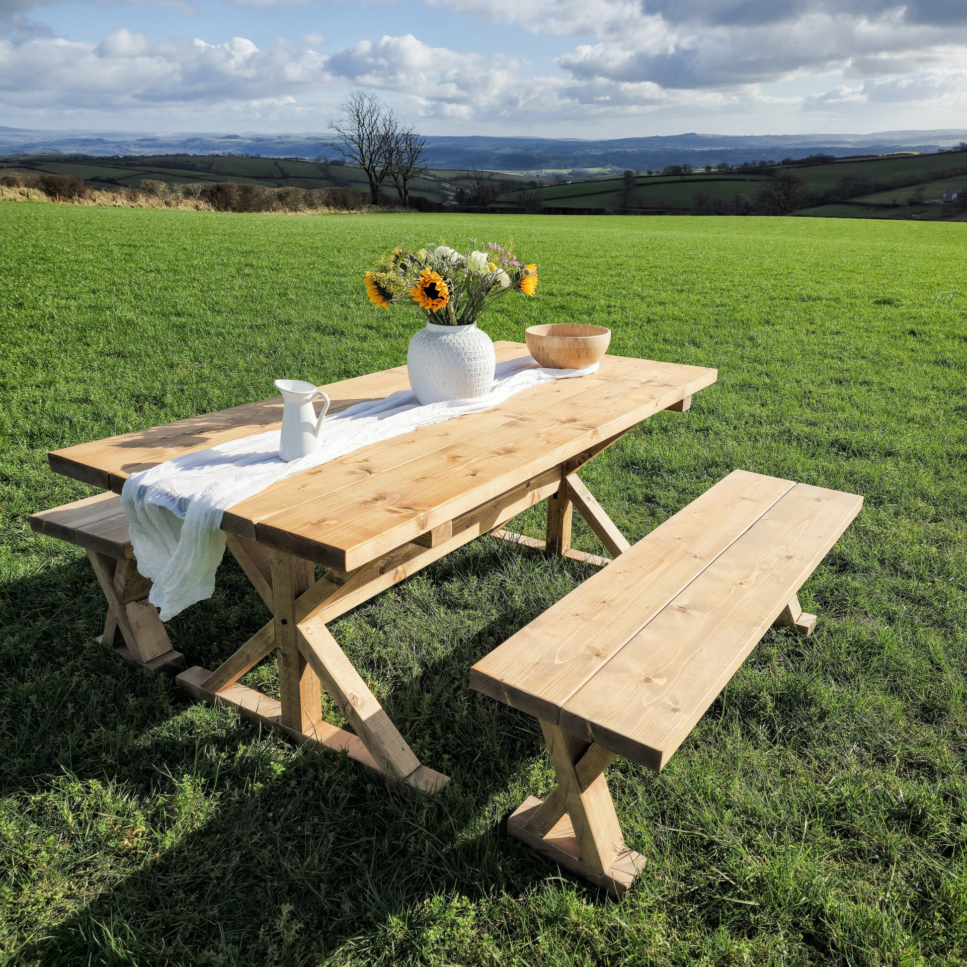 PICTURED TABLE:The pictured table is 180cm long, 88cm Wide, and 75cm tall with a Dark Oak wax finish. Pictured benches are 150cm long and 40cm wide and 45cm high.