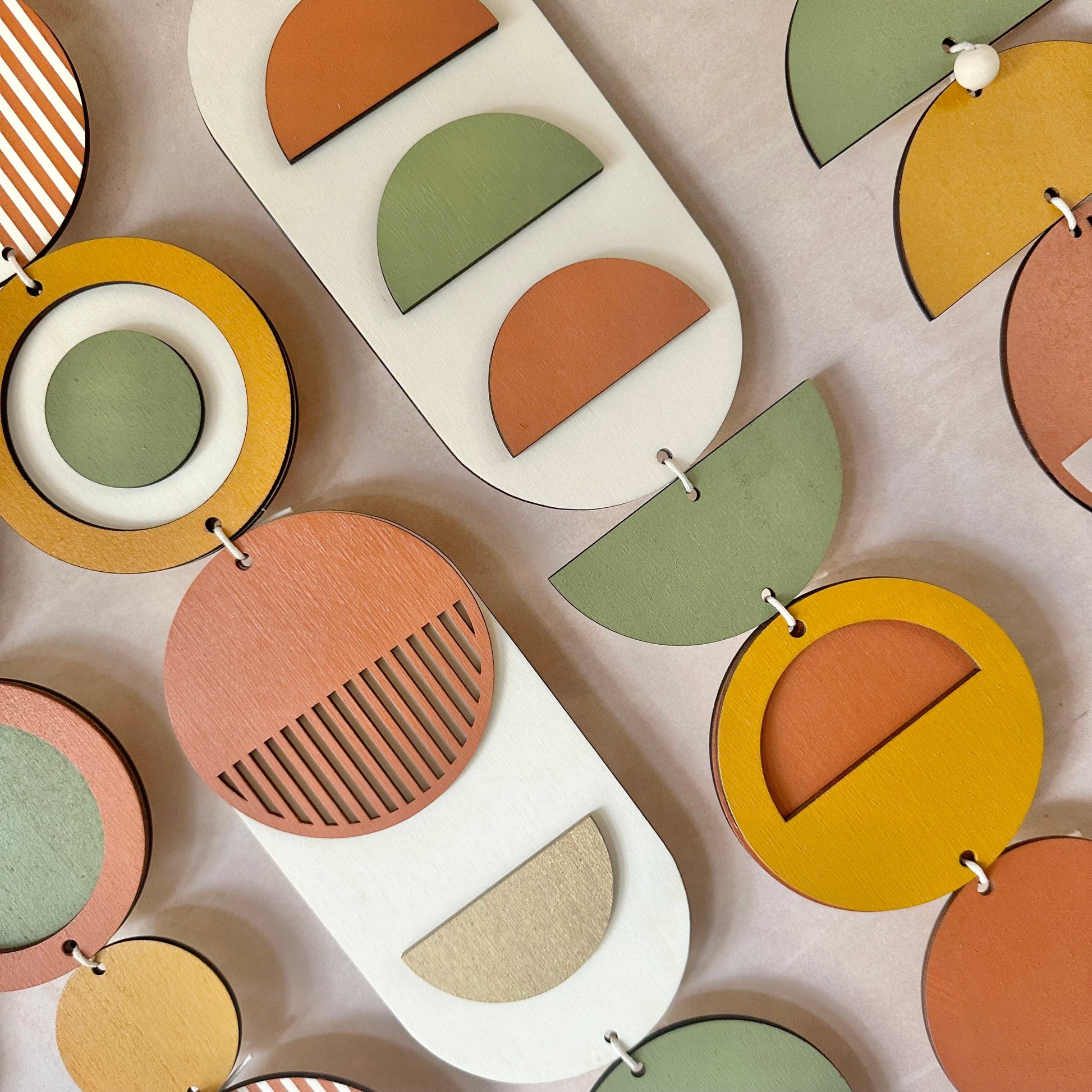 - Each plywood piece is painted in a colourful palette of oranges, yellow, green and gold.