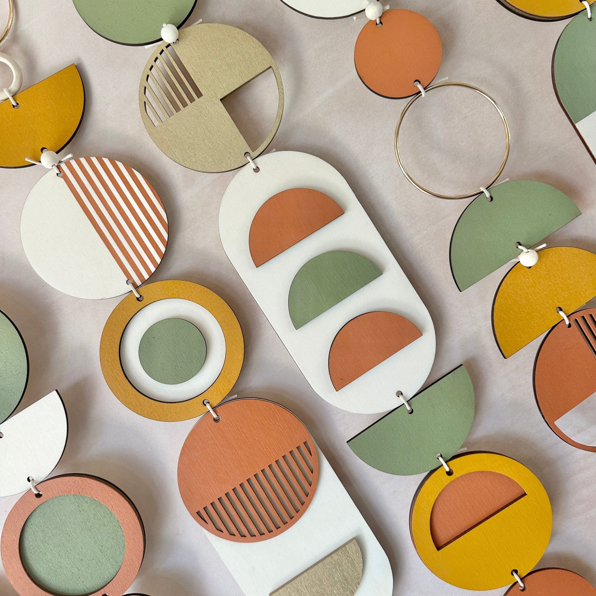 This oversized wall art will make for a great statement piece in your home decor great for filling an empty wall with some interest. The wall hanging is made from wood, metal and ceramics with hand painted geometric patterns. The overall piece is handmade and painted in a colourful palette of yellow, green, oranges and gold. Some pieces are left unpainted to let the natural colour of the wood show.