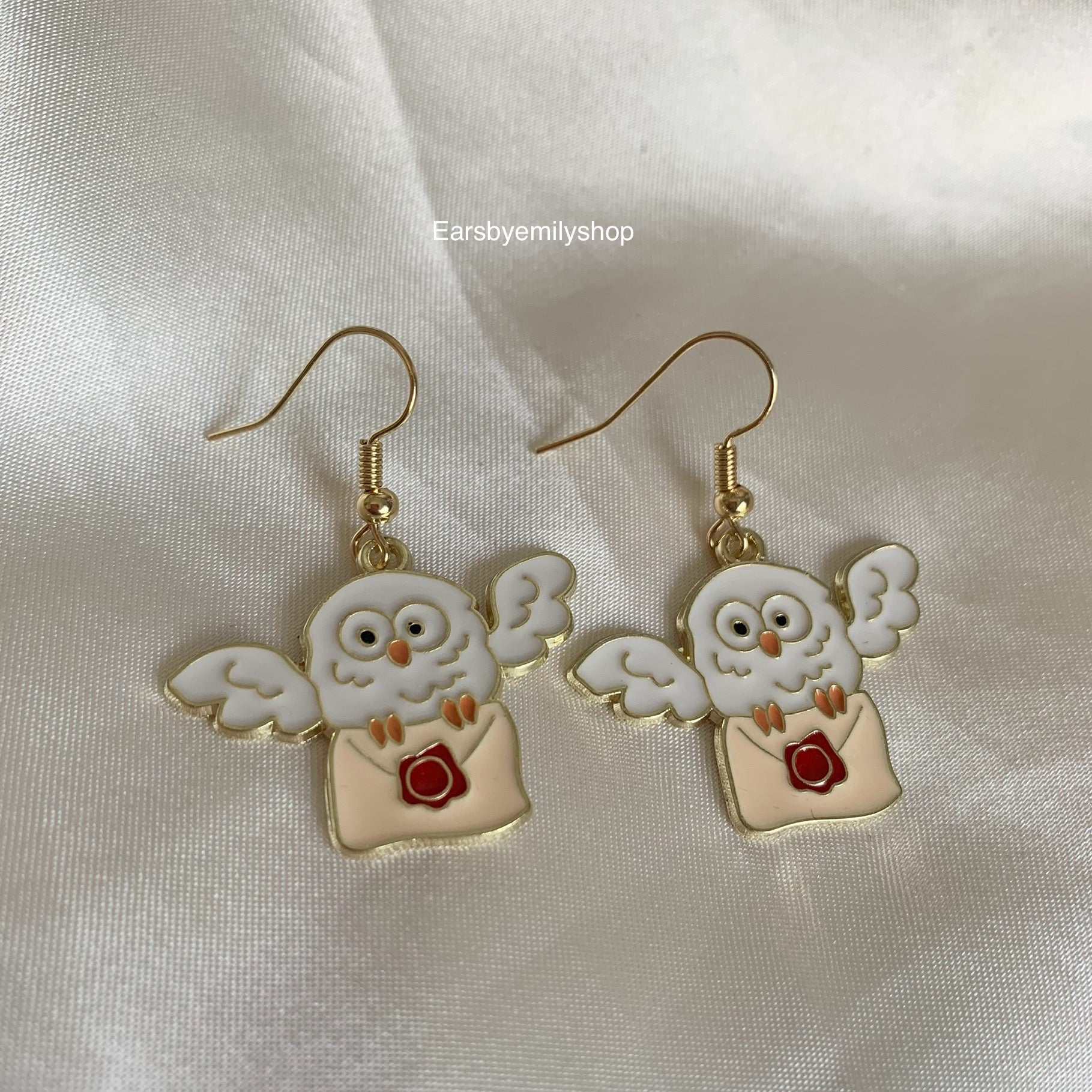 A cool pair of white flying owl dangle earrings with 18k gold plated hooks.