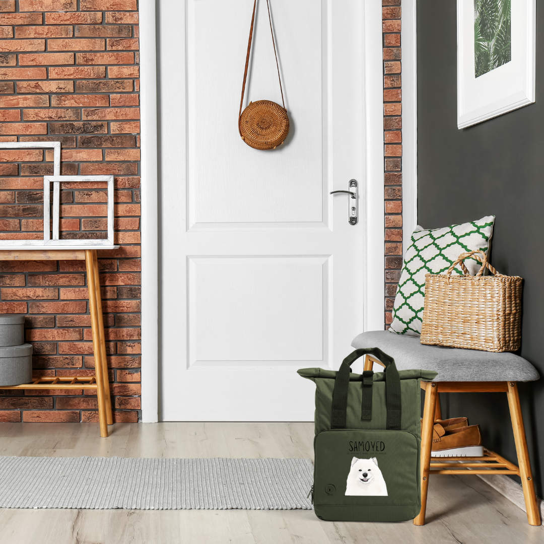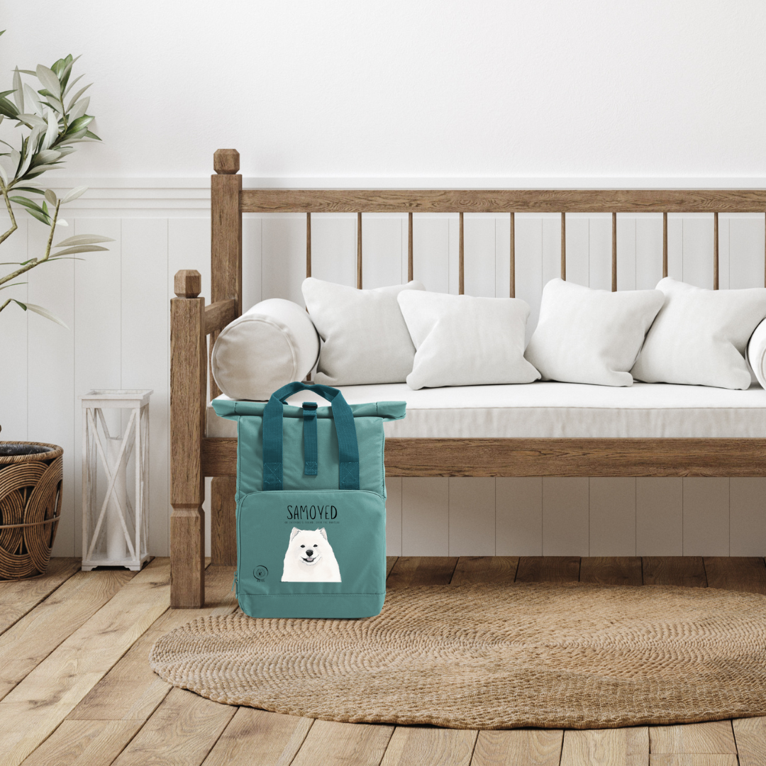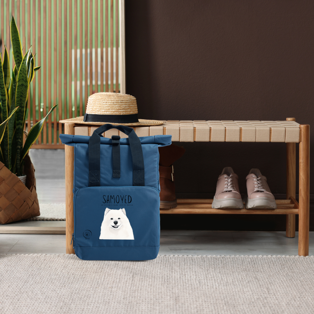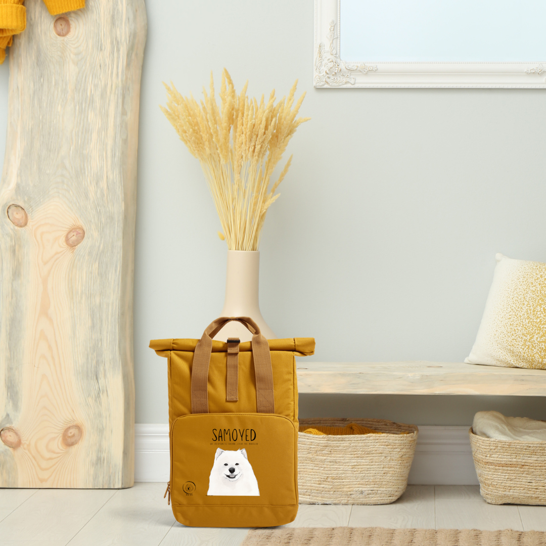 Whether you're heading to work, class, or just wandering the streets hoping to see another dog, this ethically made, high-end backpack has your back—literally. Featuring the fluffiest extrovert known to mankind, the Samoyed (aka the canine welcome committee), this bag brings charm, cheek, and a touch of chaos to your daily essentials. Spacious, sustainable, and surprisingly judgmental when you forget snacks.