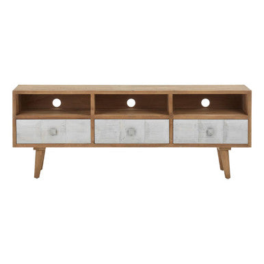 A contemporary rustic storage solution, this natural wood media unit boasts three white drawers, each with a geometric bevelled pattern and square handle.
