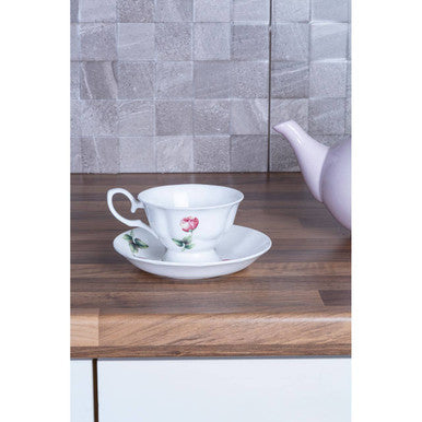 The striking, delicate peony design cup and saucer set is accentuated on the chic white for a beautiful effect. The exquisite design of the cup and saucer will add a sense of occasion to your daily tea and coffee routine. Made from durable, strong bone china and dishwasher safe, the elegant mug is suitable for everyday use. Keep your surface protected from spillages and marks by placing the cup on the made to fit saucer.