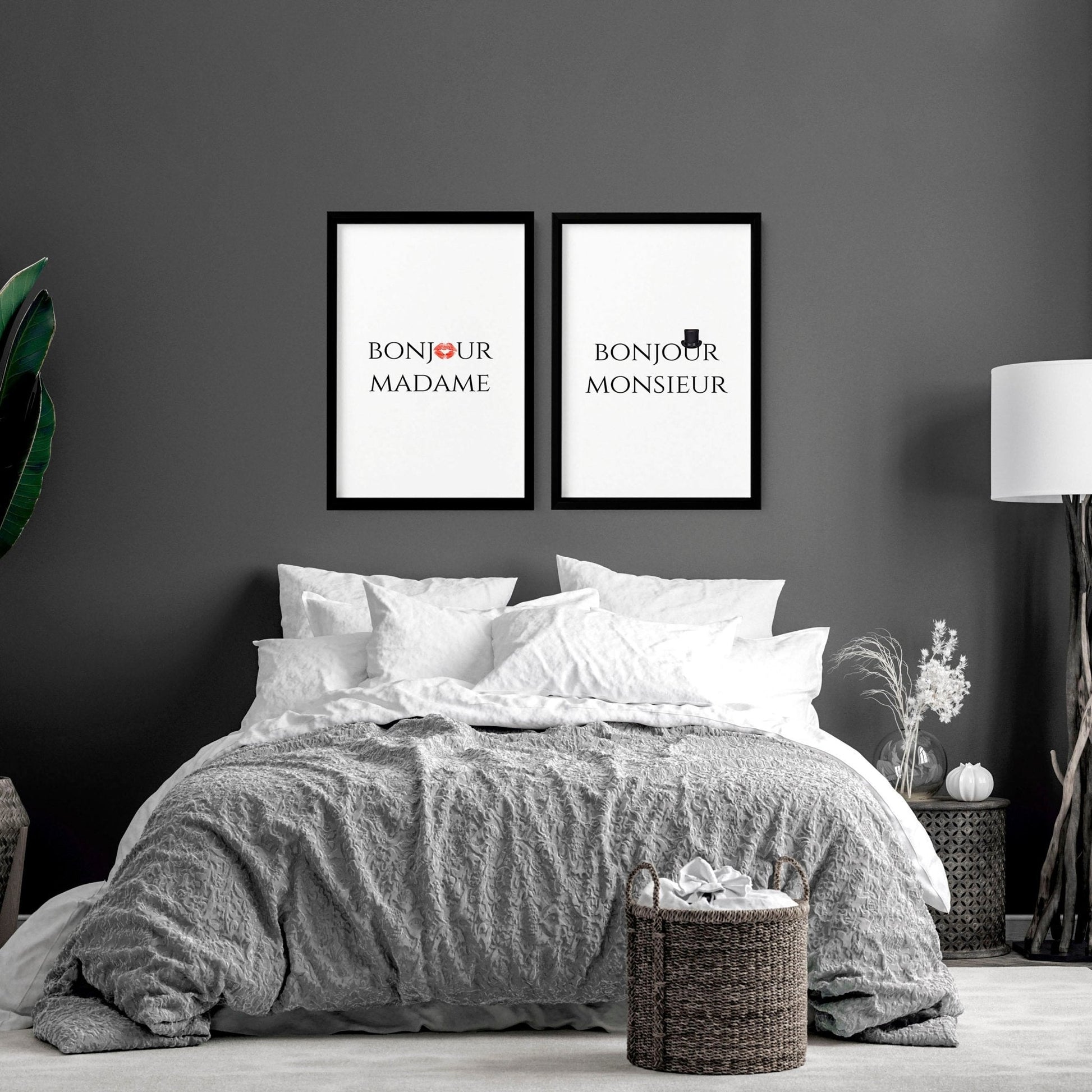 These prints are indeed perfect for adding a playful and romantic atmosphere to your bedroom or living room decor. The elegant typography and simple yet stylish design make them a wonderful choice for couples who appreciate a touch of French-inspired flair.