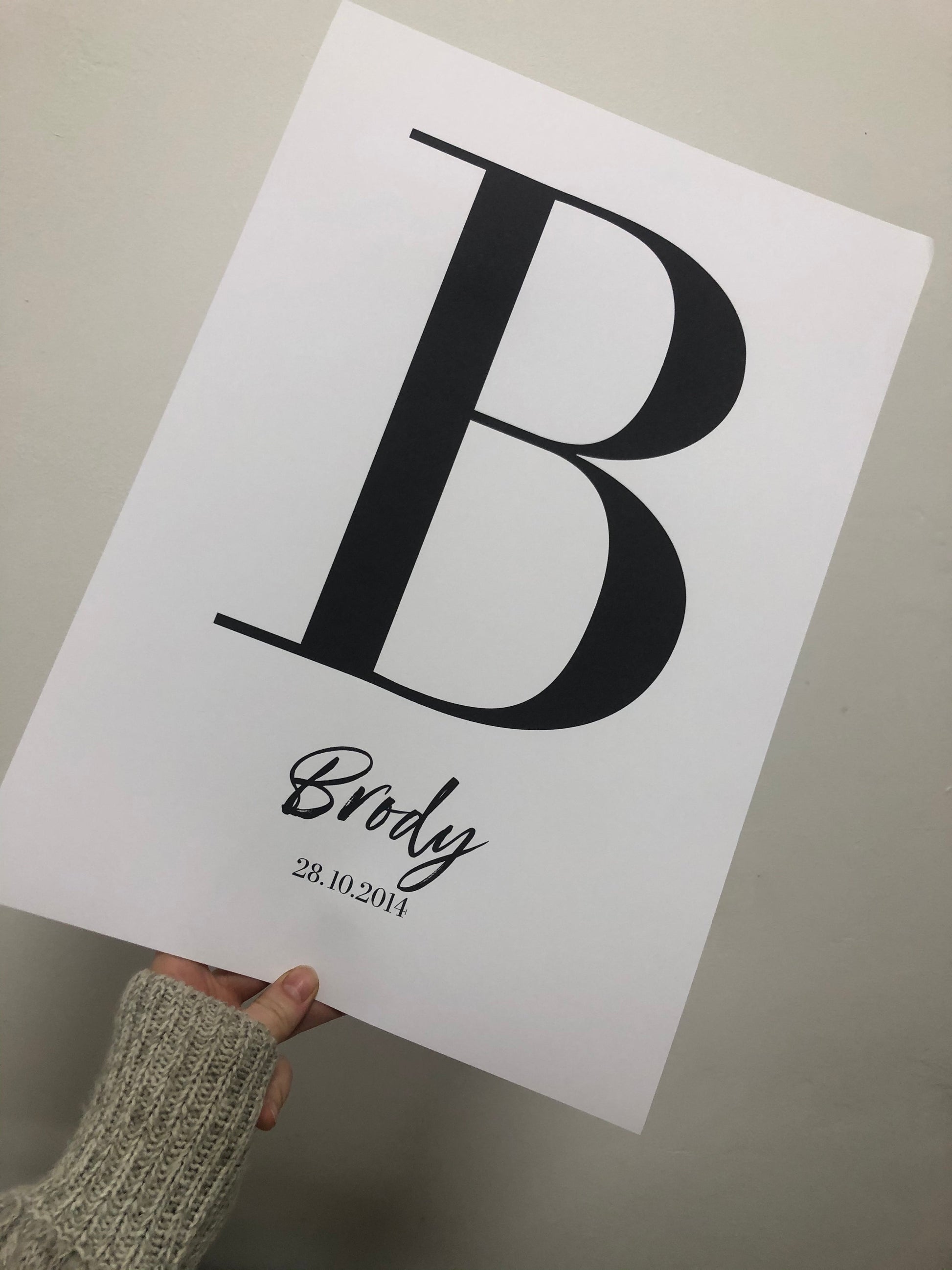 Personalised Black Name Initial DOB Children's Teenagers Room Wall Decor Print
