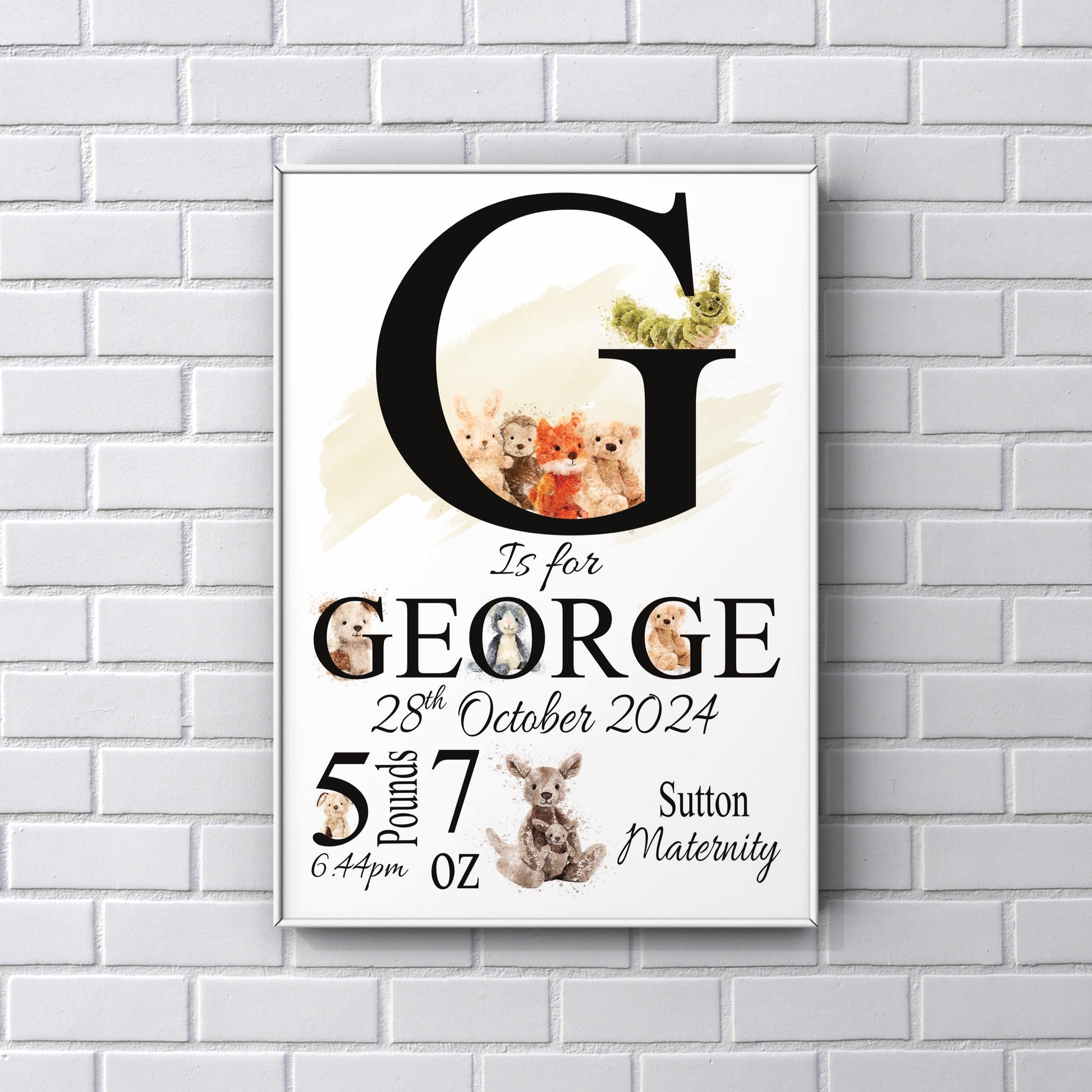 A personalised printed gift for your newborn baby complete with their name, date and time of birth.