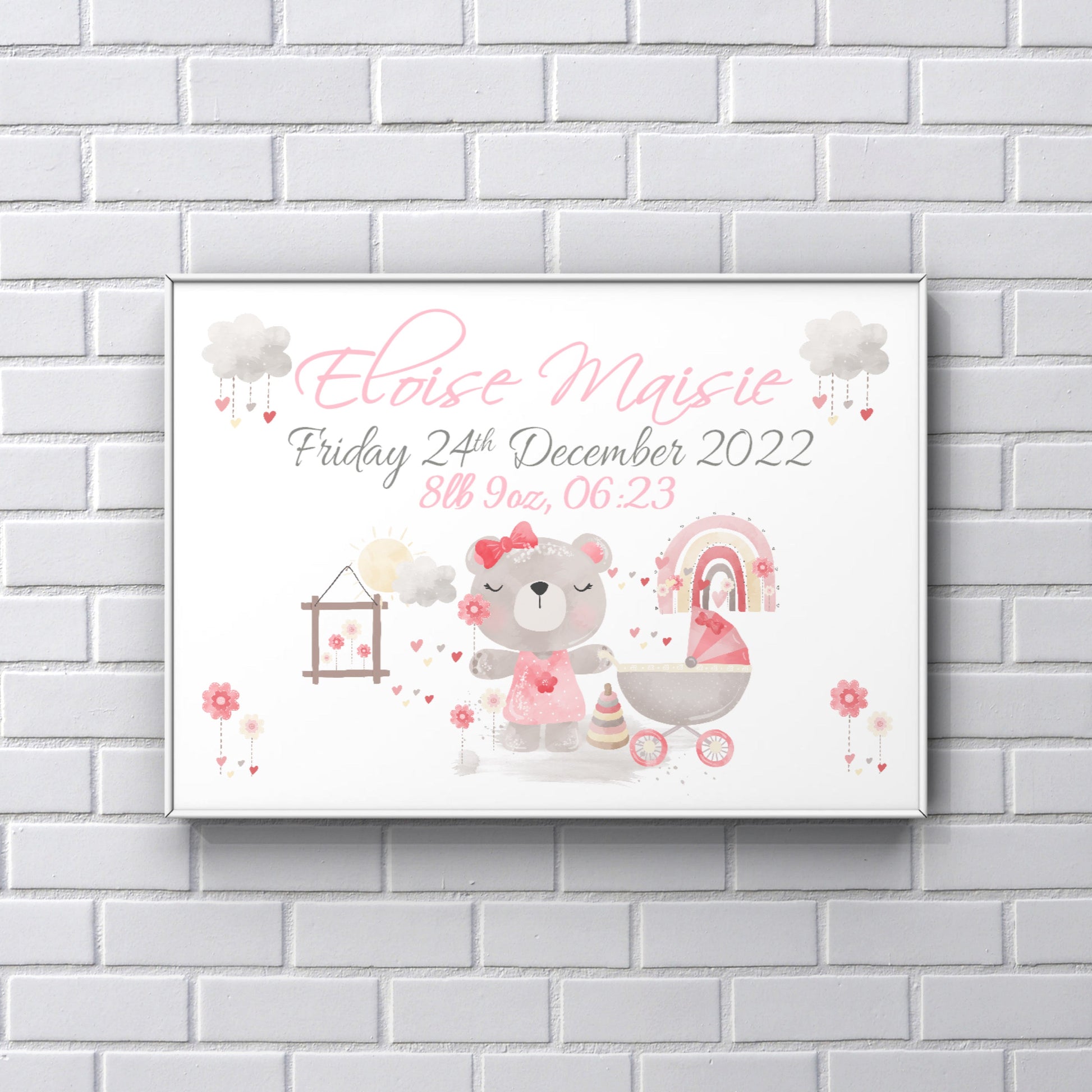 A personalised printed gift for your newborn baby complete with their name, date and time of birth.
