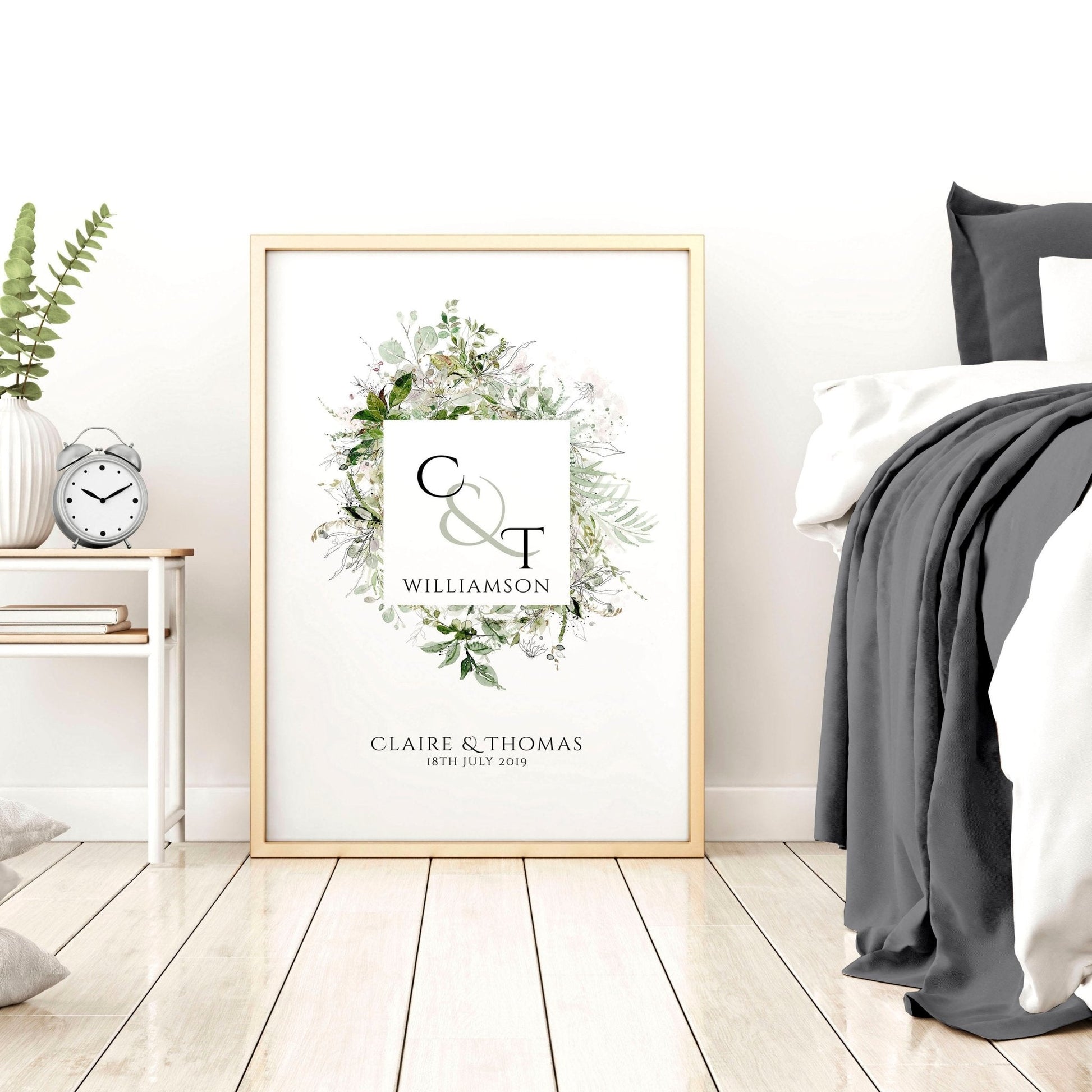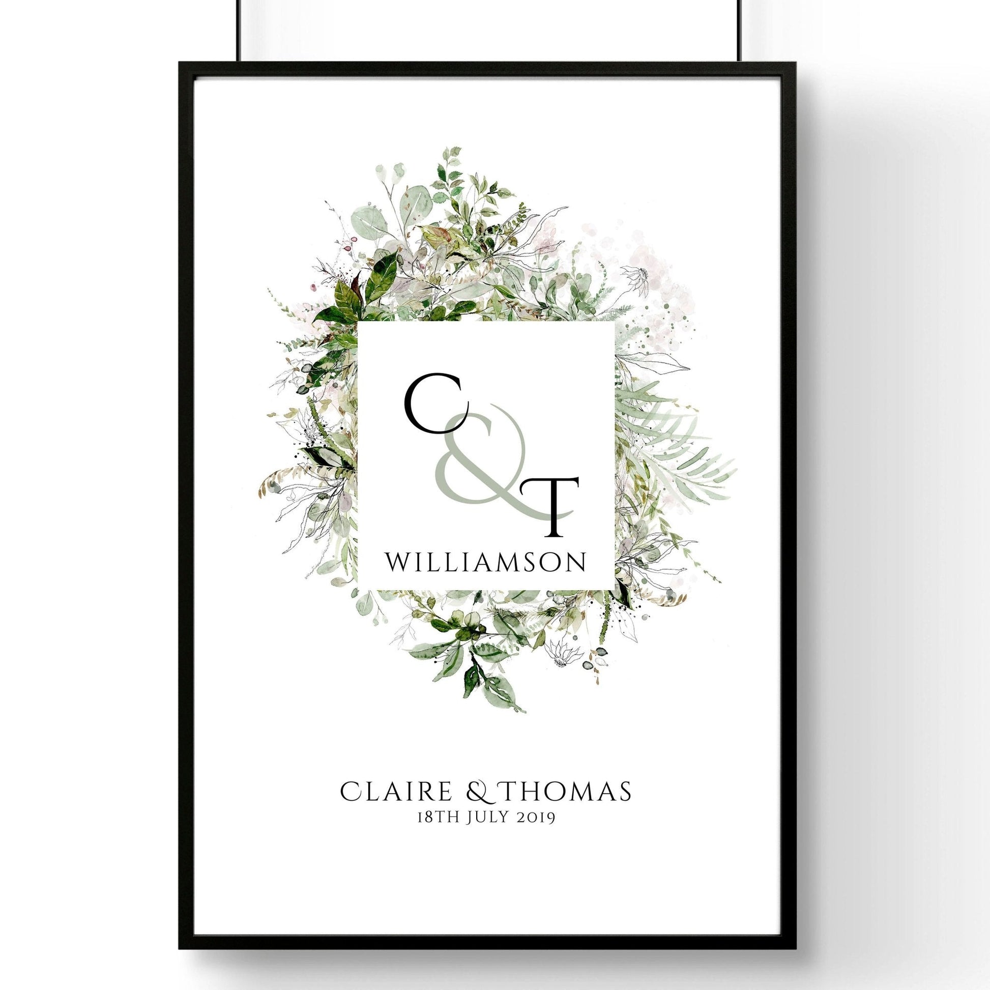Celebrate your love and cherished moments with our Personalised valentines gift wall art print, a stunning wall art print. This unique piece indeed features a beautiful botanical monogram adorned with the names of the couple and their anniversary date. Set in soothing watercolour sage green tones, it is the perfect anniversary gift for your loved one.